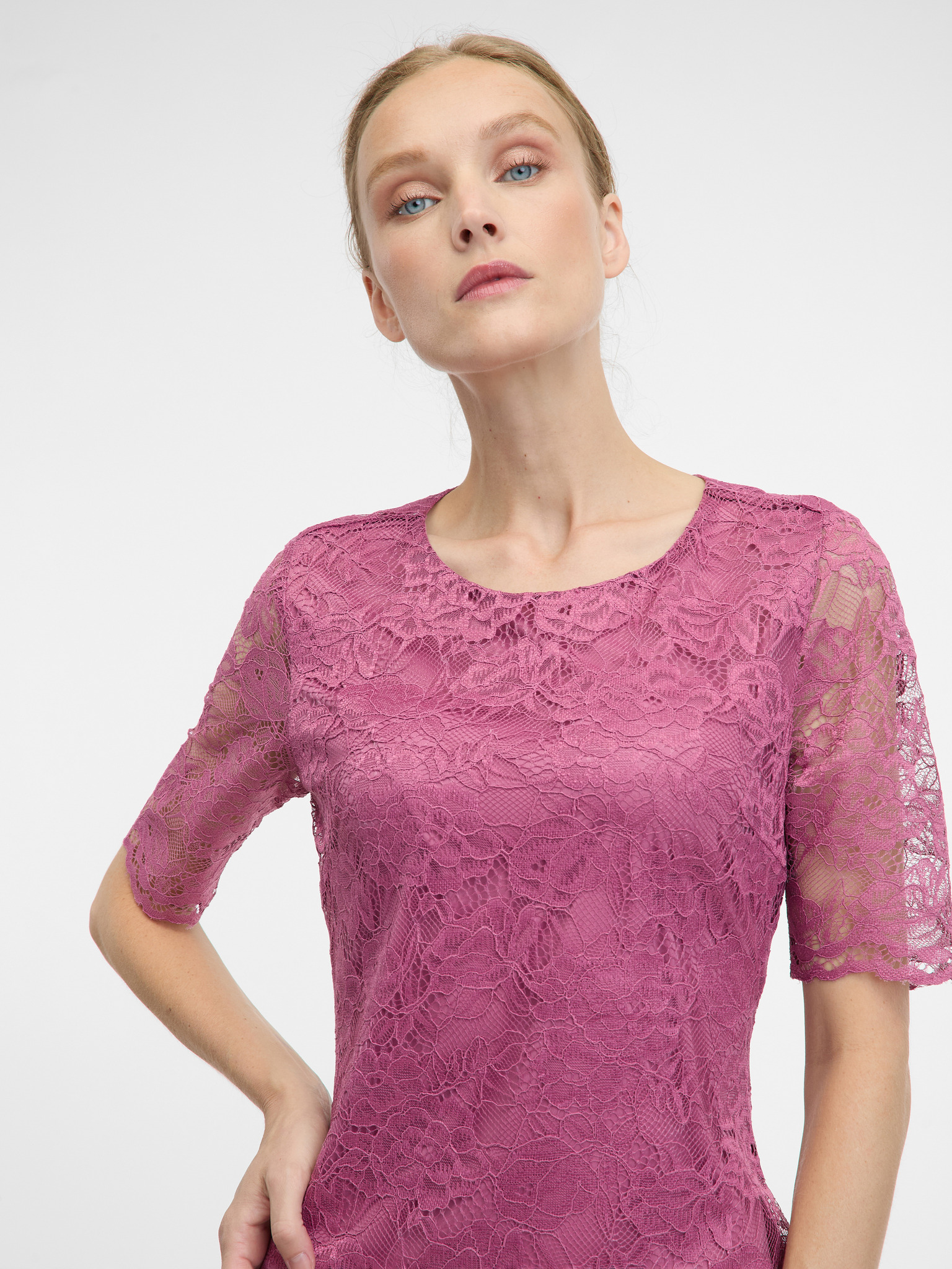 Дантелена рокля с деколте - малинова Numoco