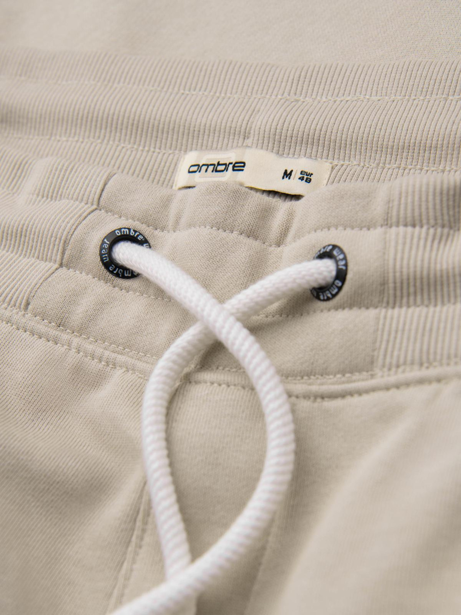 Мъжки спортни панталони с оребрени маншети и декоративен цип - пясъчен Ombre Clothing