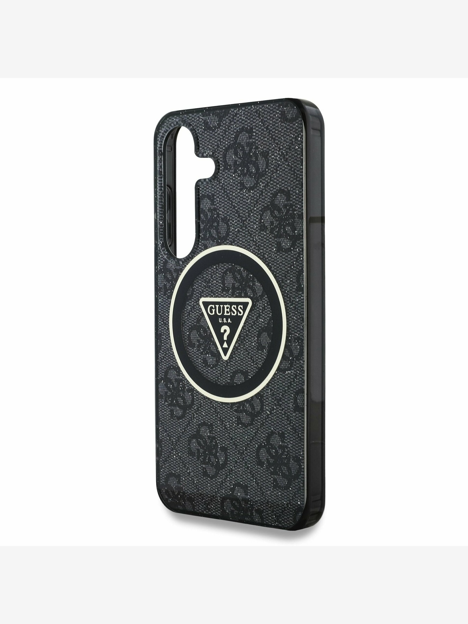 Guess PU Grained 4G Logo Stand Camera Frame Заден капак за iPhone 15 Pro Max Черно