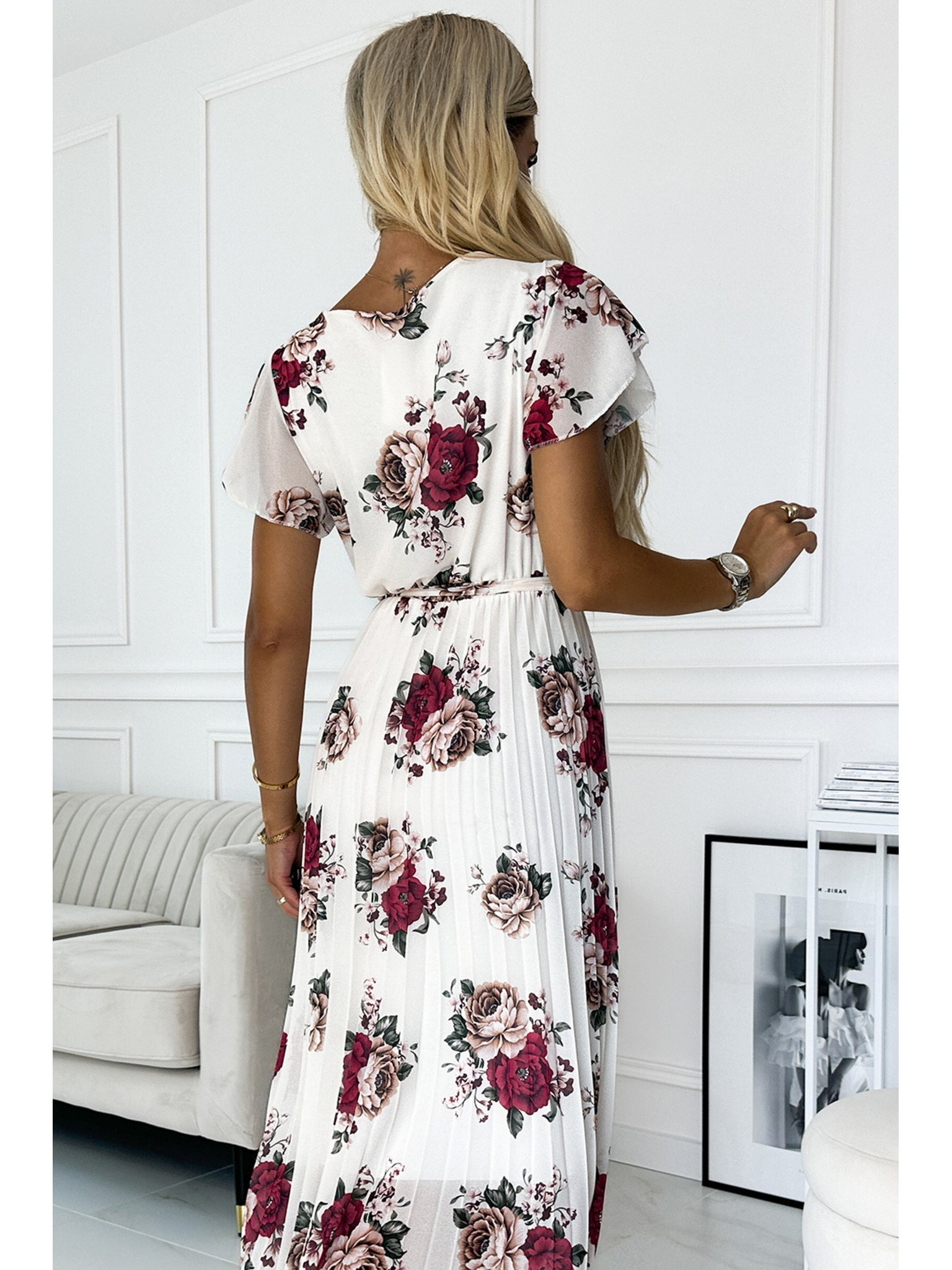 Плисирана миди рокля с деколте и волани - тъмночервени рози
