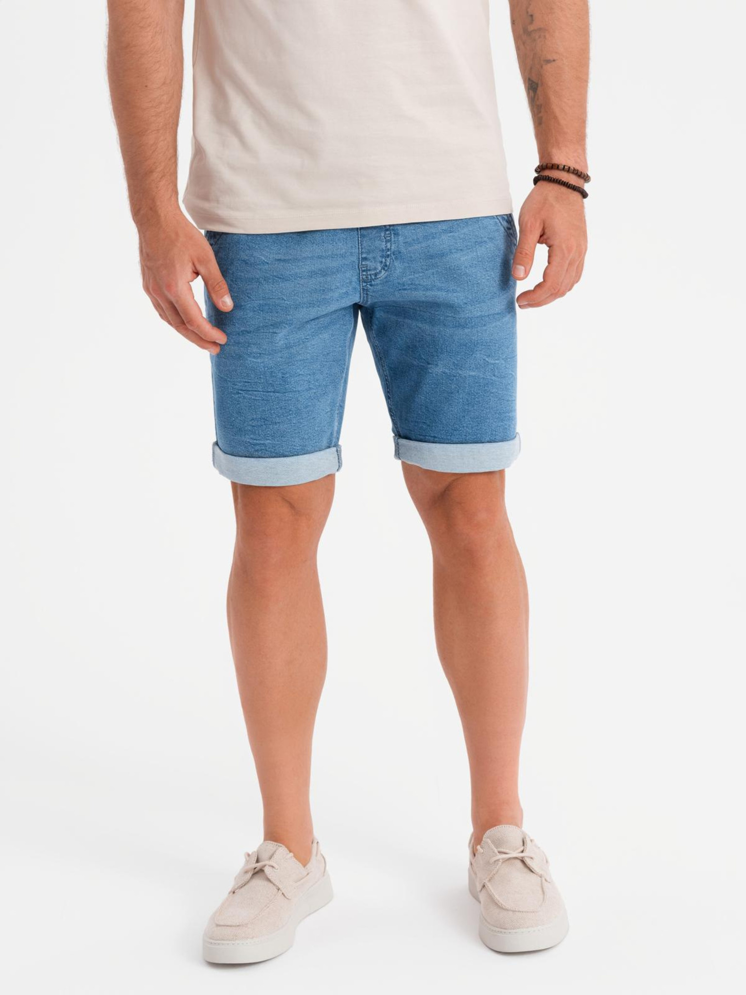 Мъжки дънкови шорти с подгъната крачол - кремаво