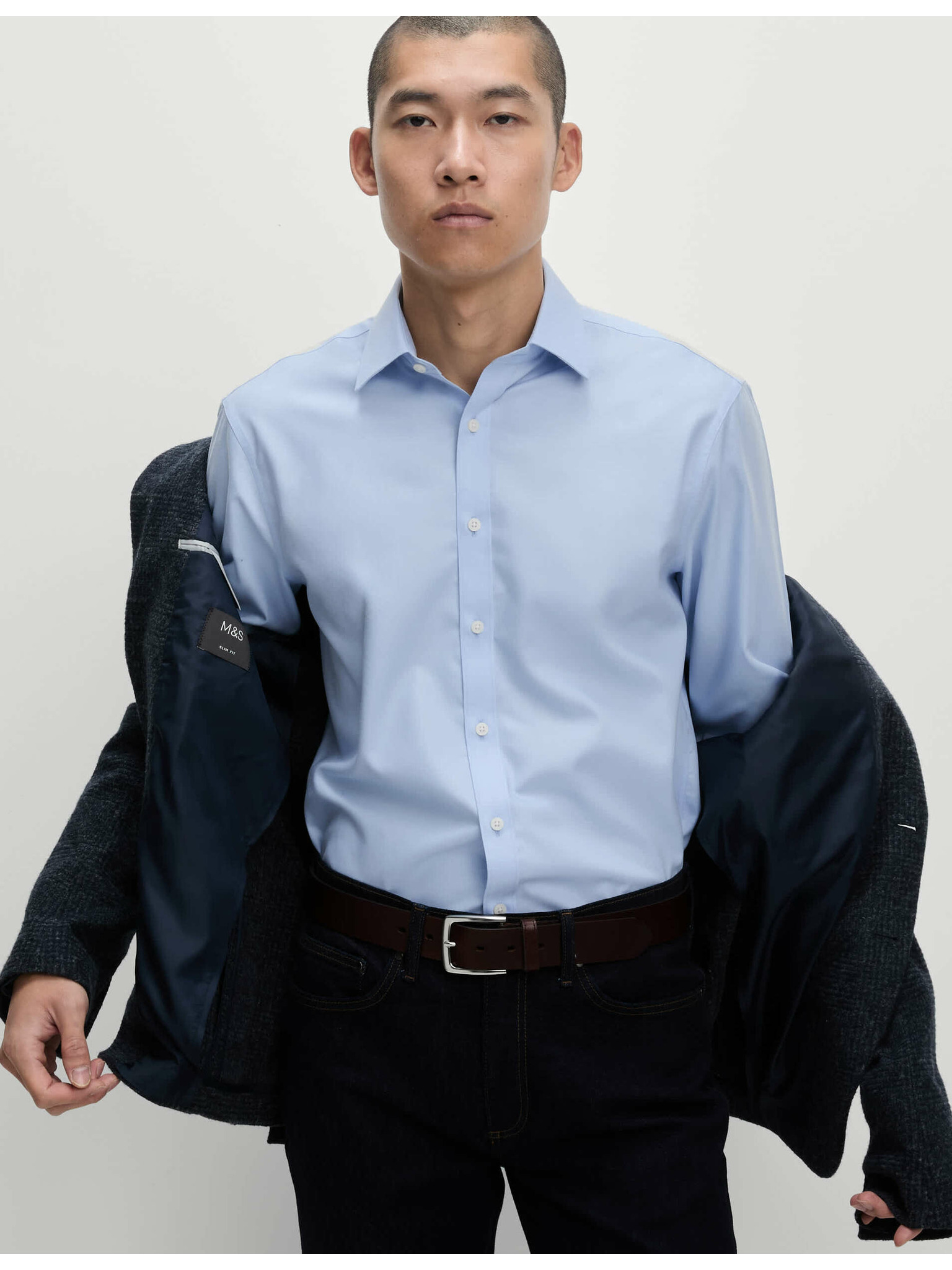 Риза с тесен силует от памучна смес с незабавна обработка Marks & Spencer синя