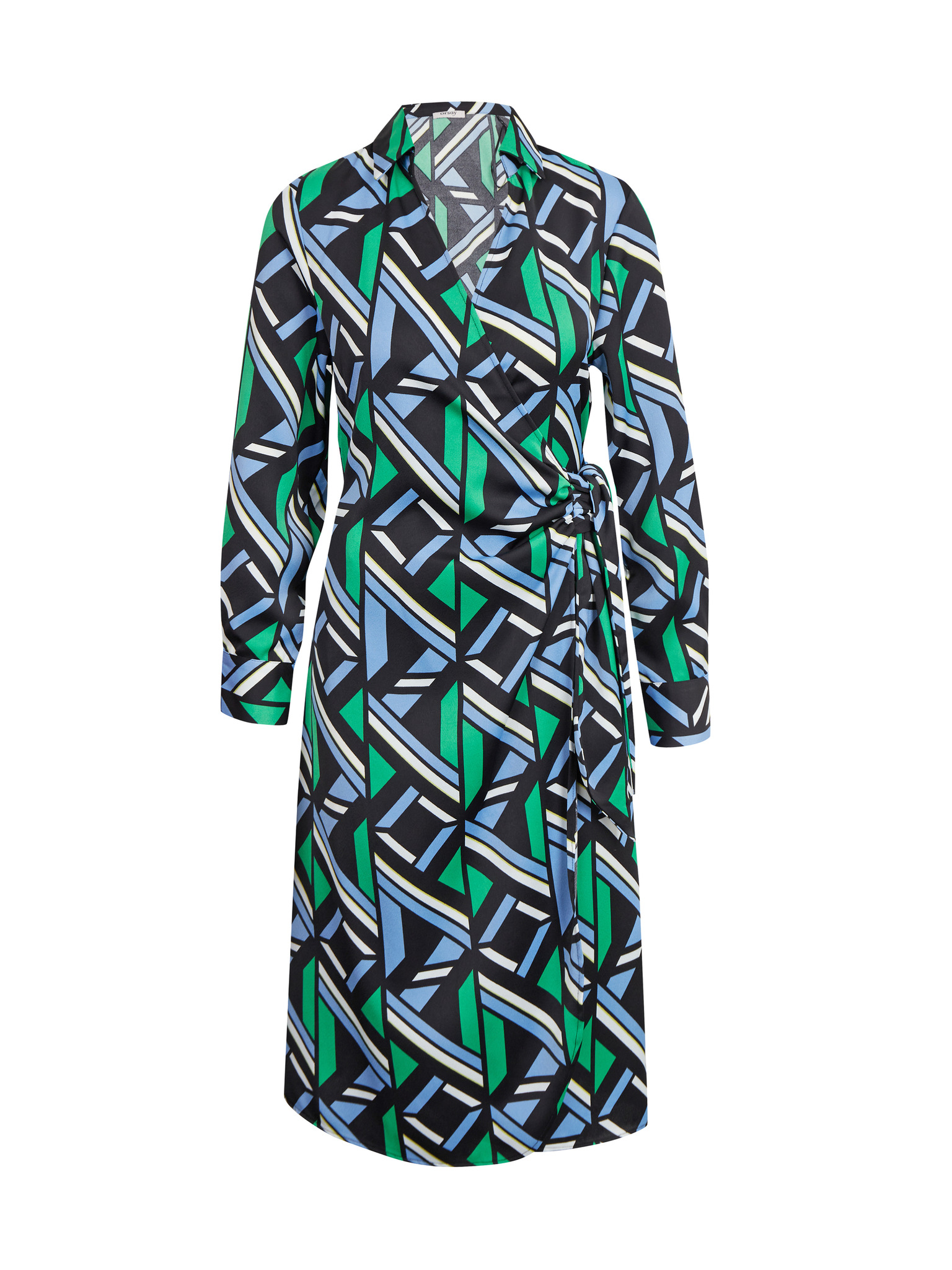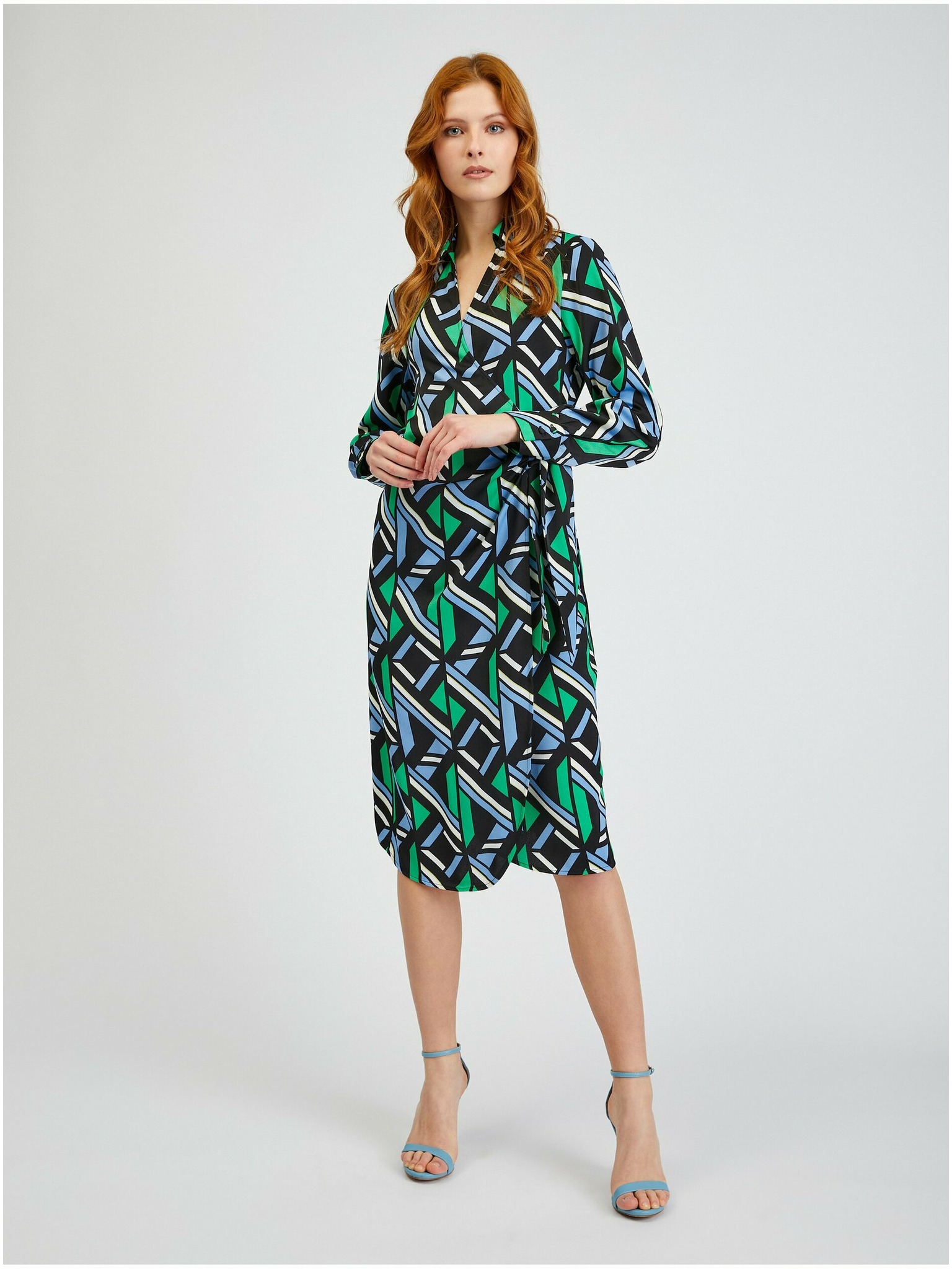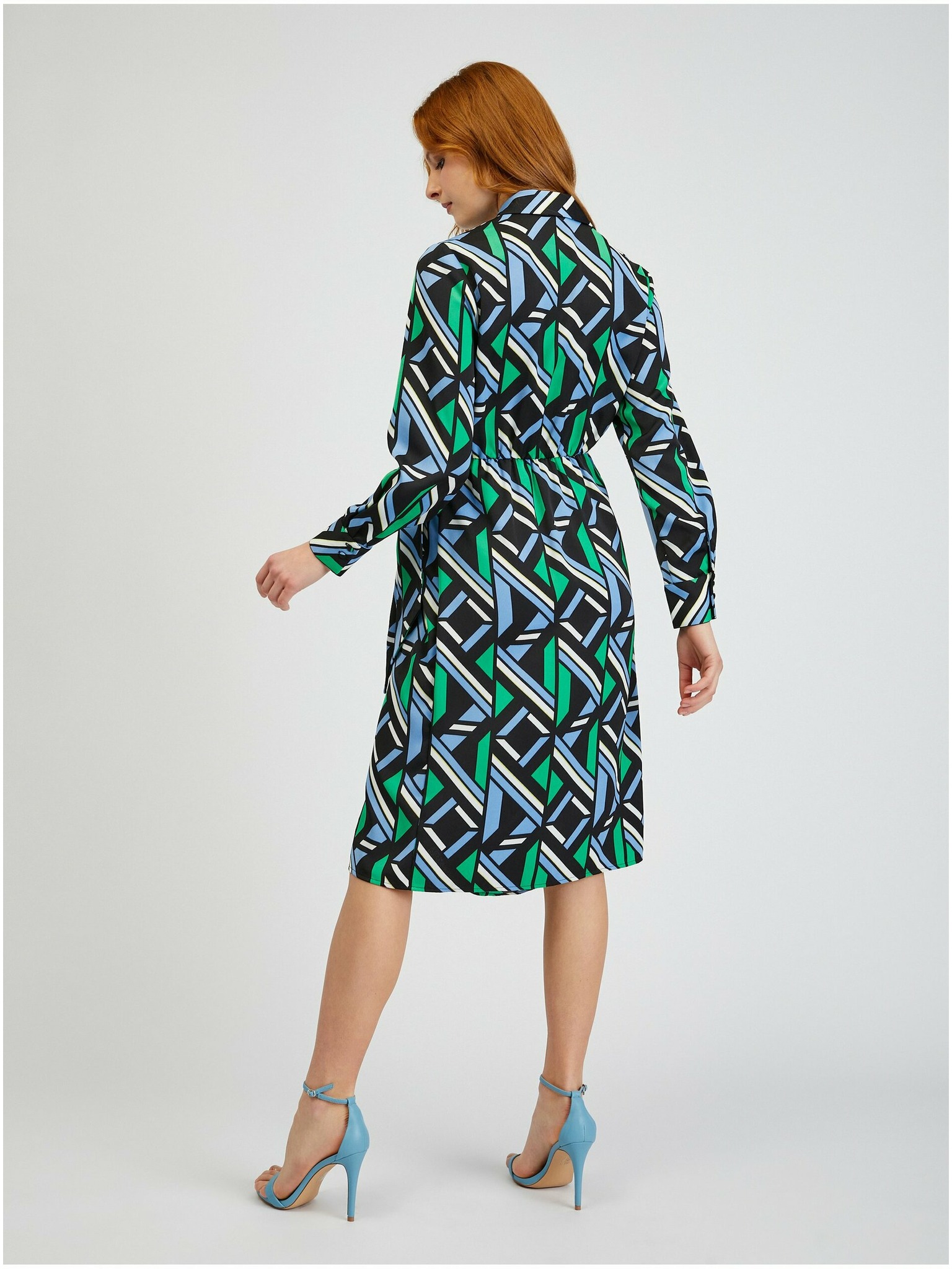 Синя дамска сатенена миди рокля с десен ORSAY