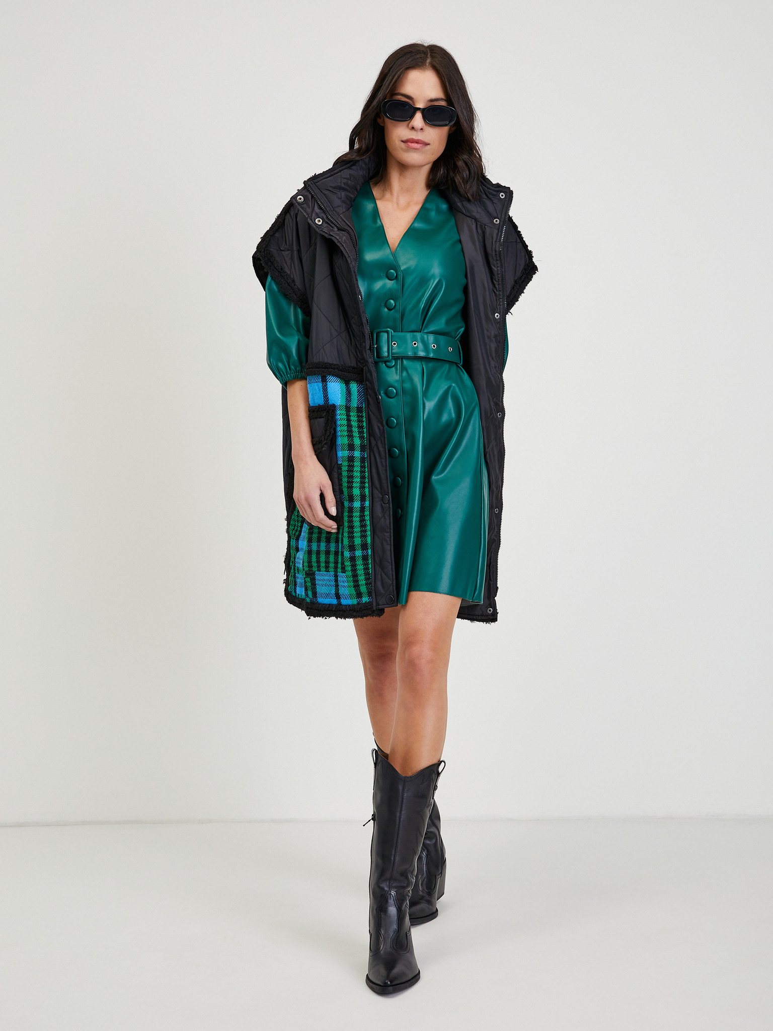 562-4 NASTIA Дълга рокля с деколте и къс ръкав - зелена