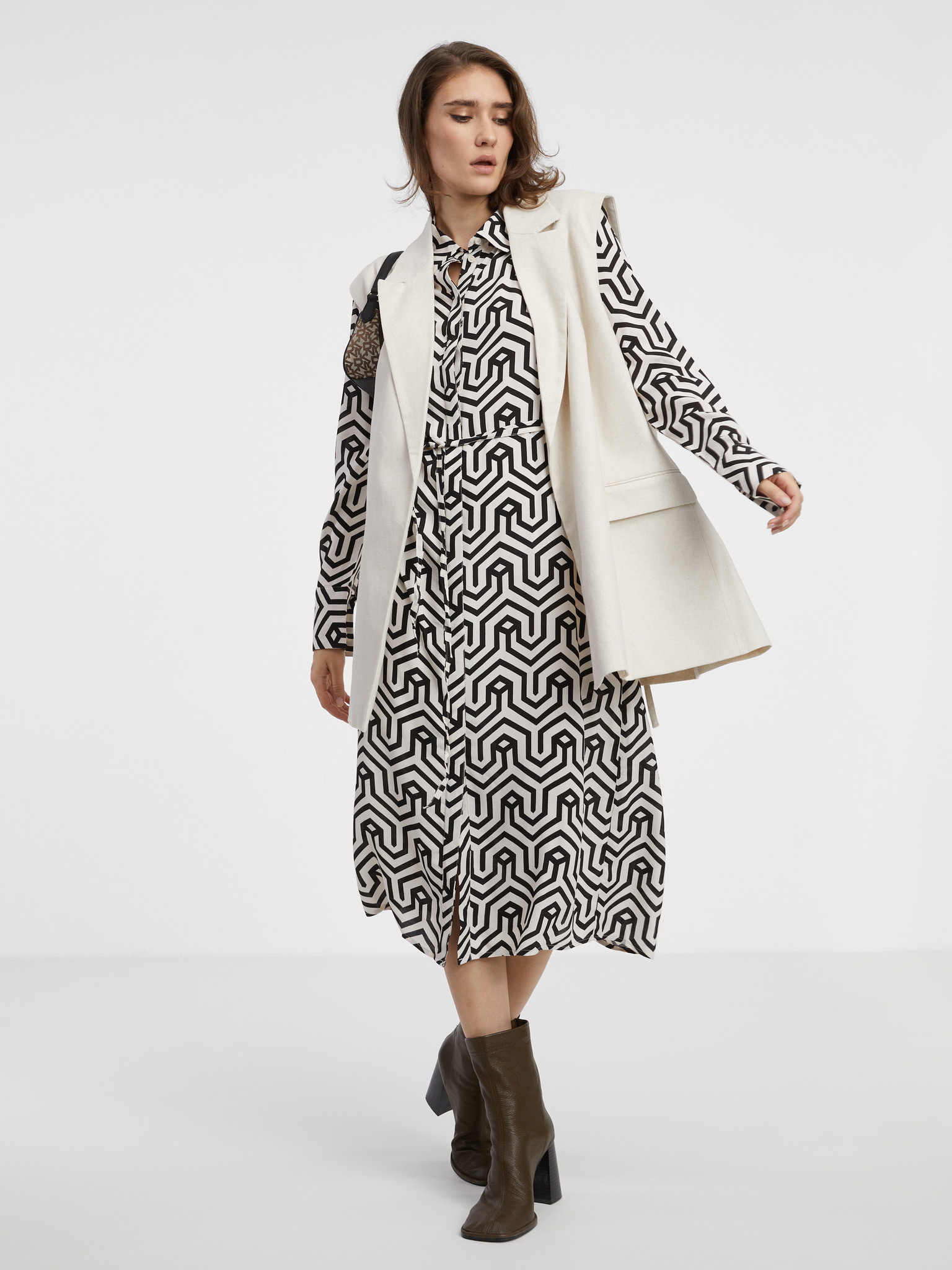 Елегантна миди риза-рокля със златни копчета и колан