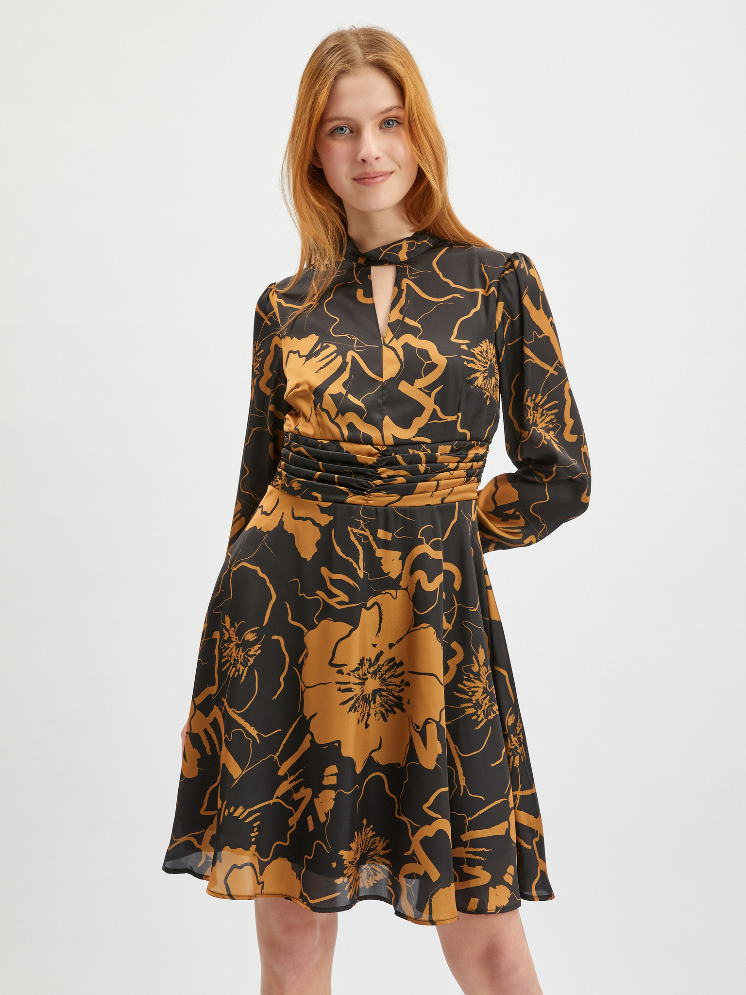 Кафяво-черна дамска сатенена рокля на цветя ORSAY