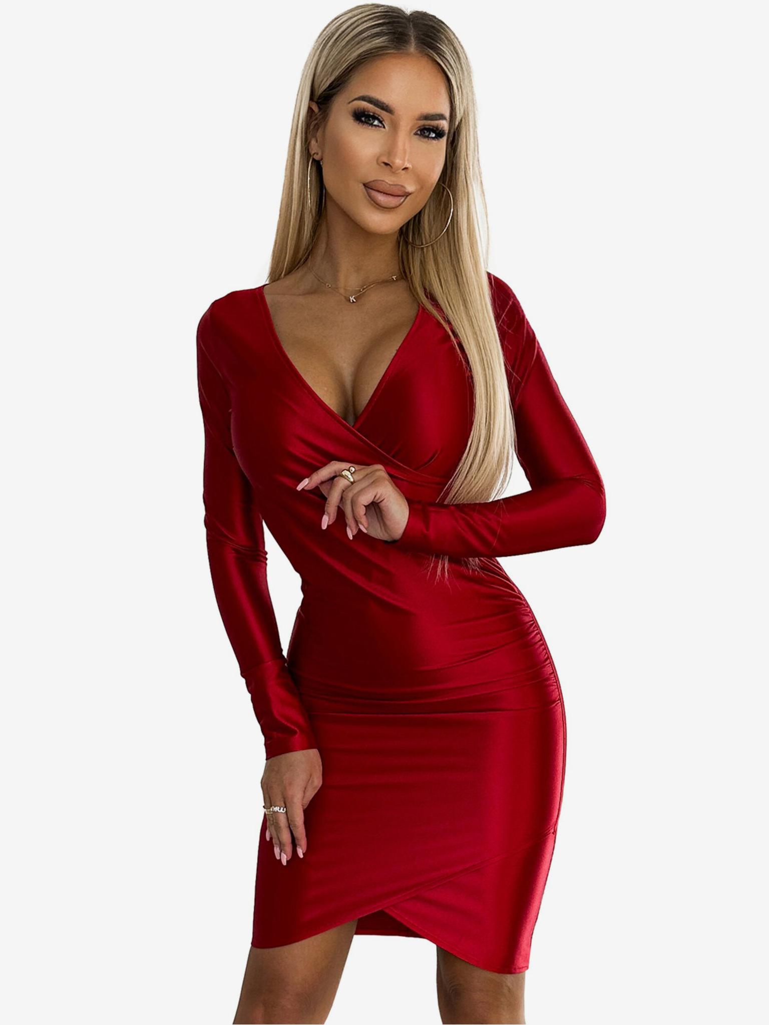 Прилепнали рокля с деколте тип висяща табела - червена с брокат