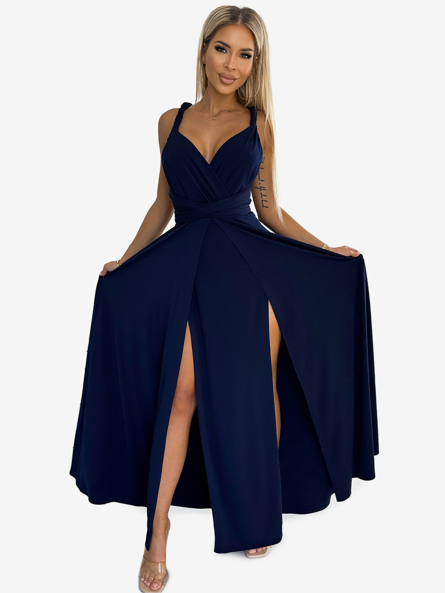 Дълга блестяща рокля с деколте - тъмно синя Numoco CRYSTAL