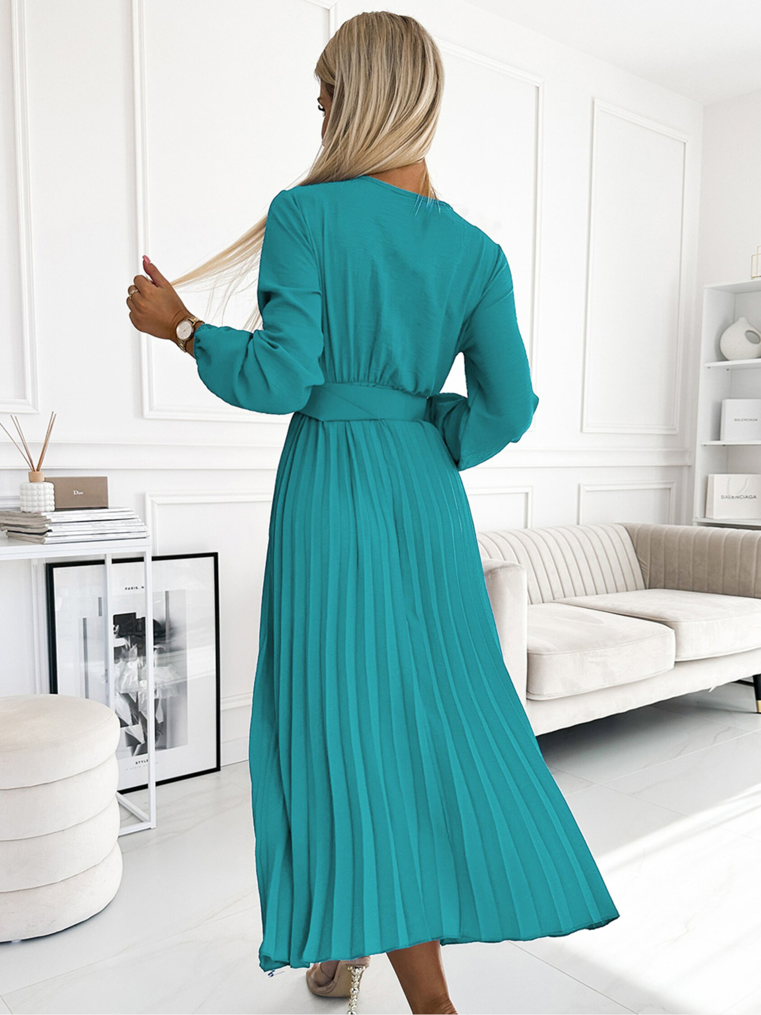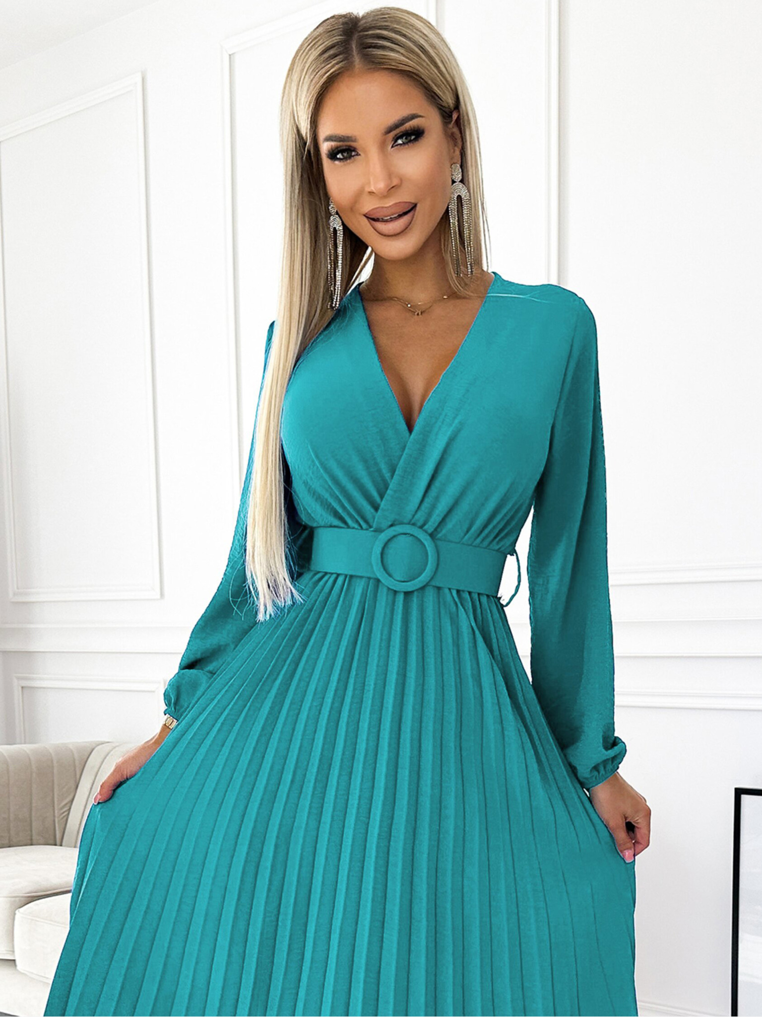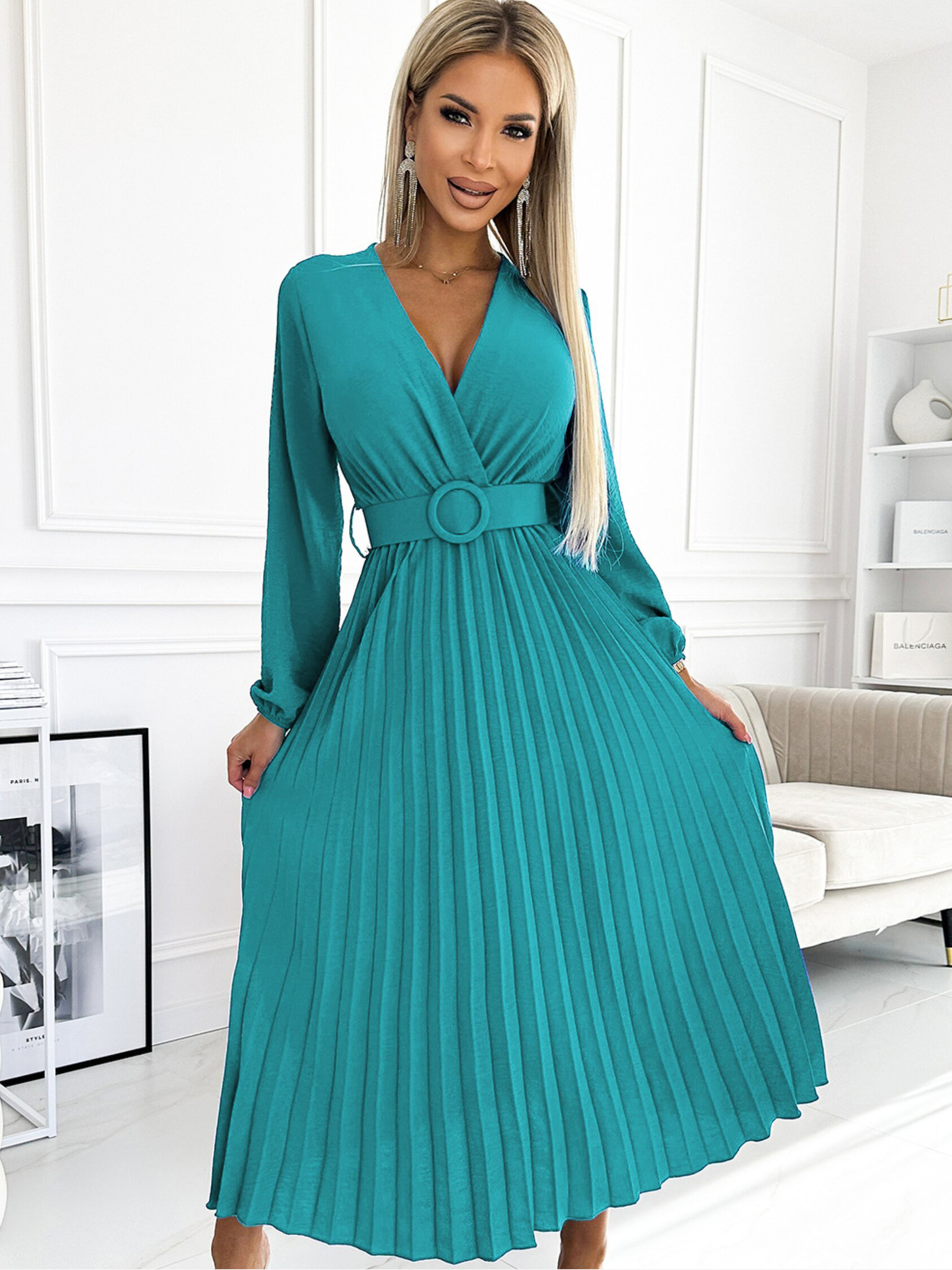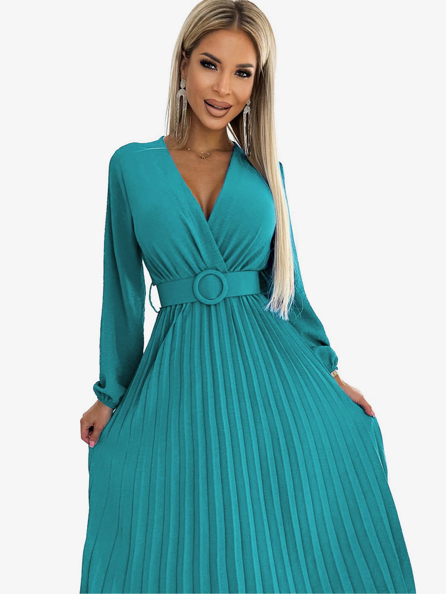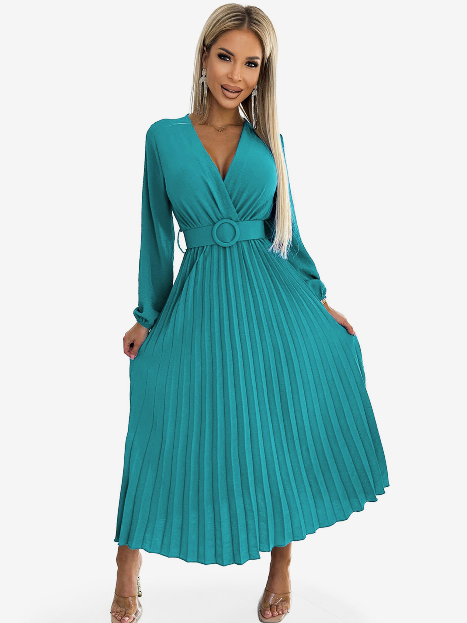 NINA Елегантни рокли с кръстосан деколте, ръкав и колан - кралско синьо