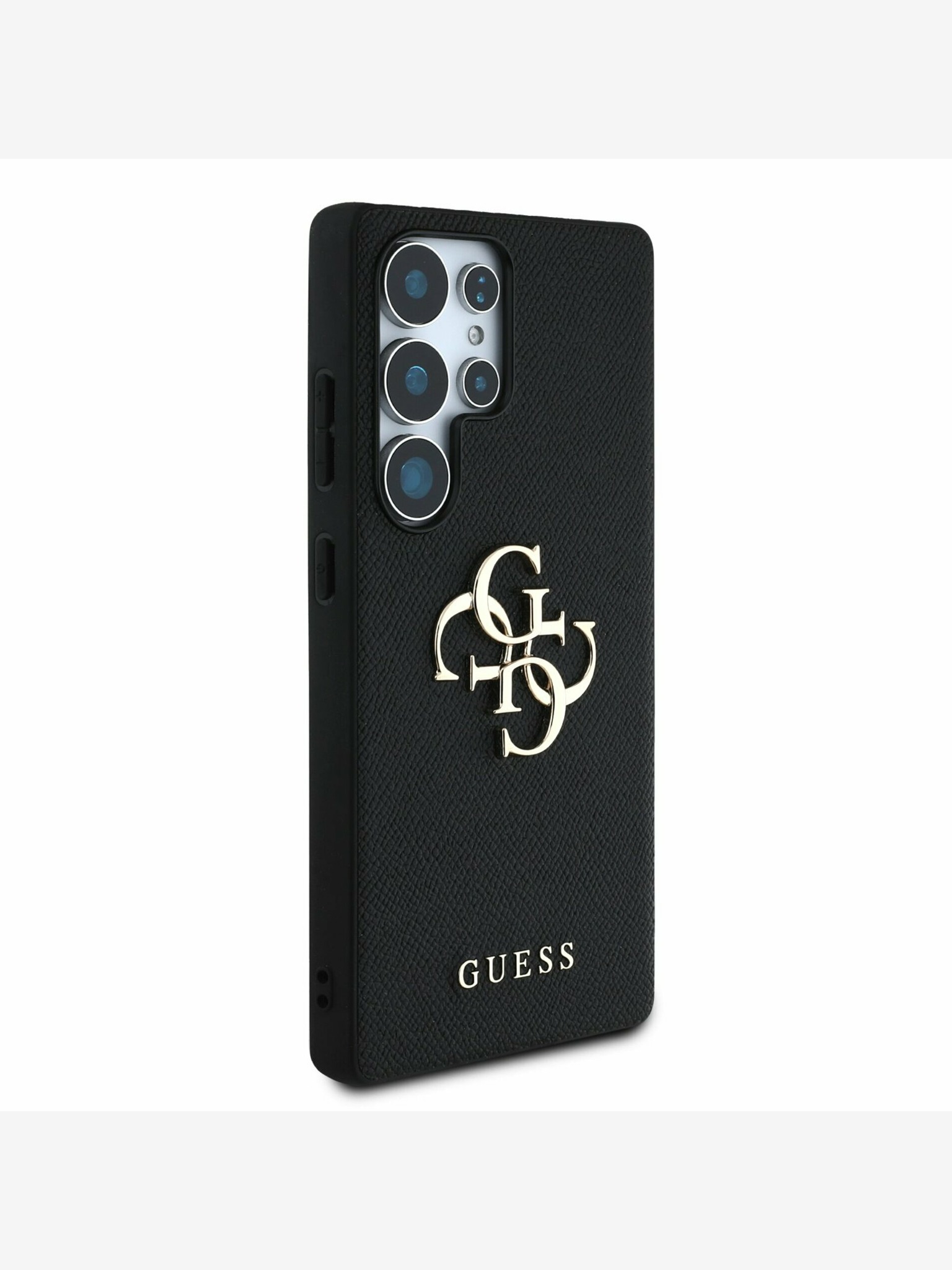 Guess PU Grained 4G Logo Stand Camera Frame Заден капак за iPhone 15 Pro Черно