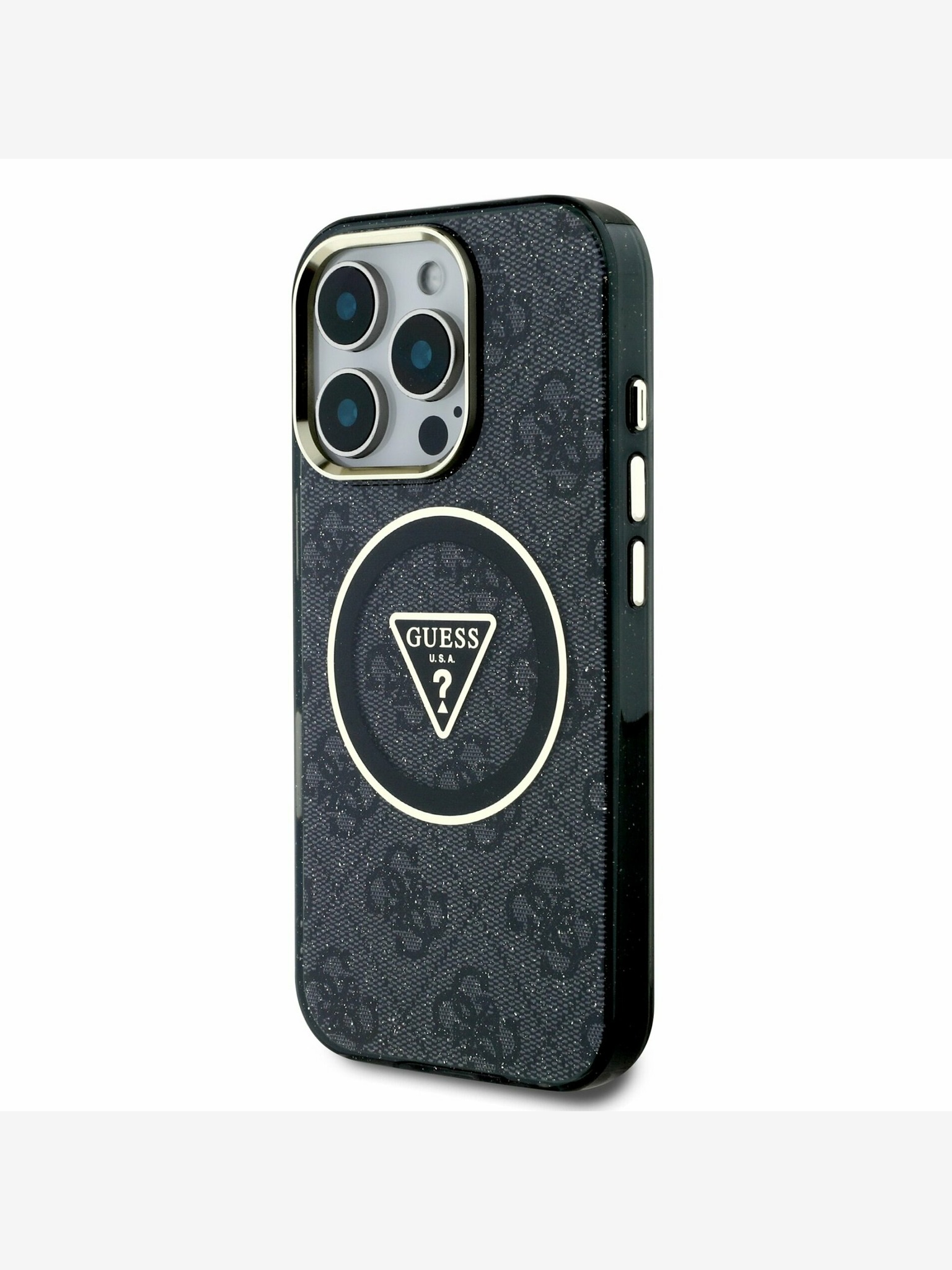 Guess PU Grained 4G Logo Stand Camera Frame Заден капак за iPhone 15 Pro Черно