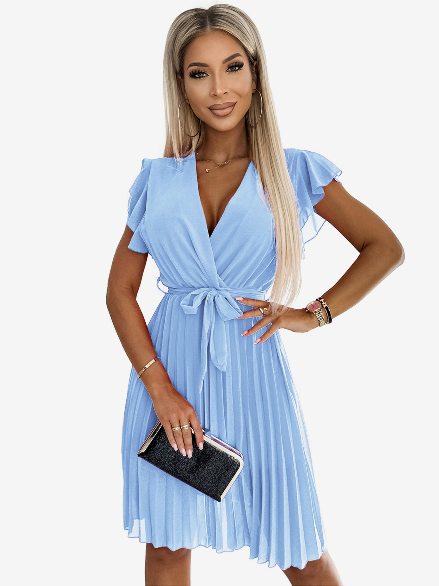 Шифонена плисирана рокля с деколте с волани - светло синьо Numoco