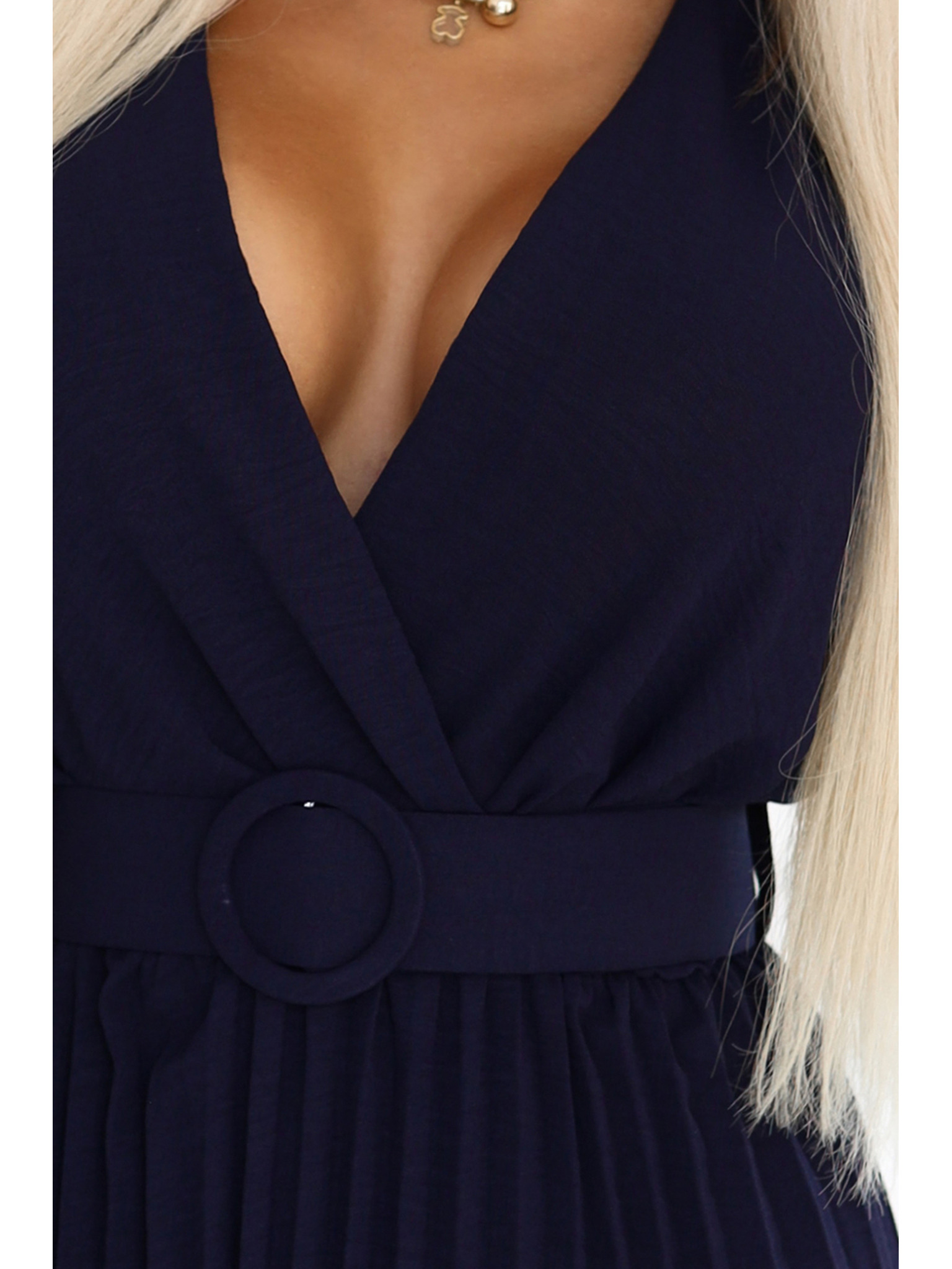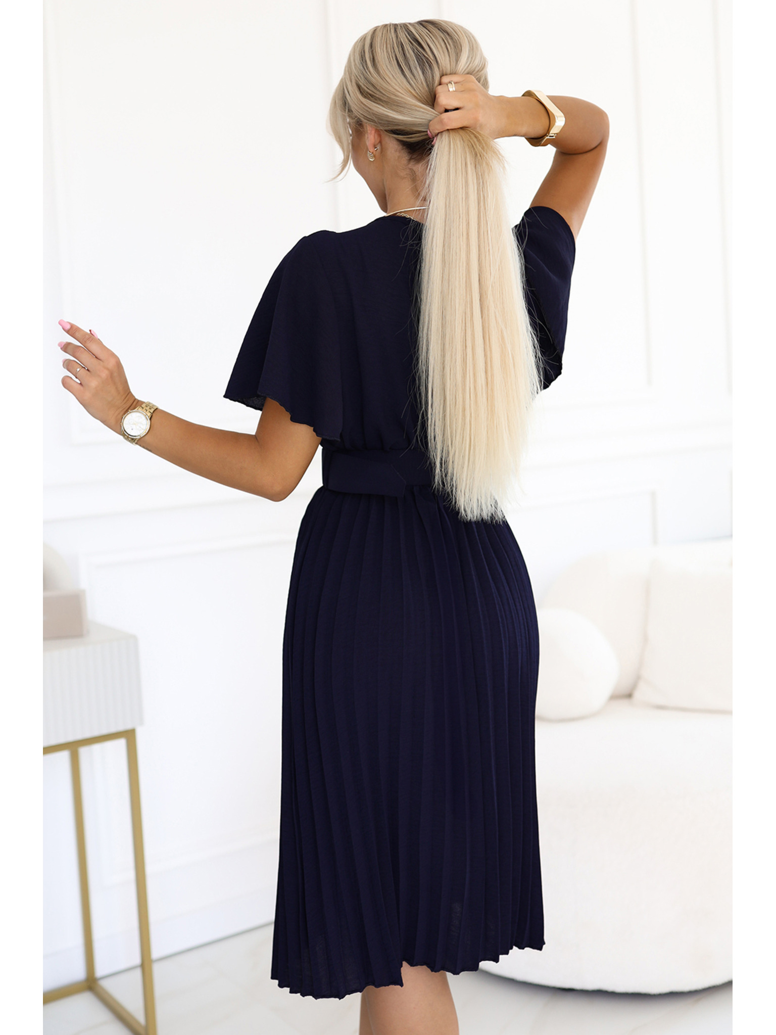 Плисирана миди рокля с преплитащо се деколте и широк колан