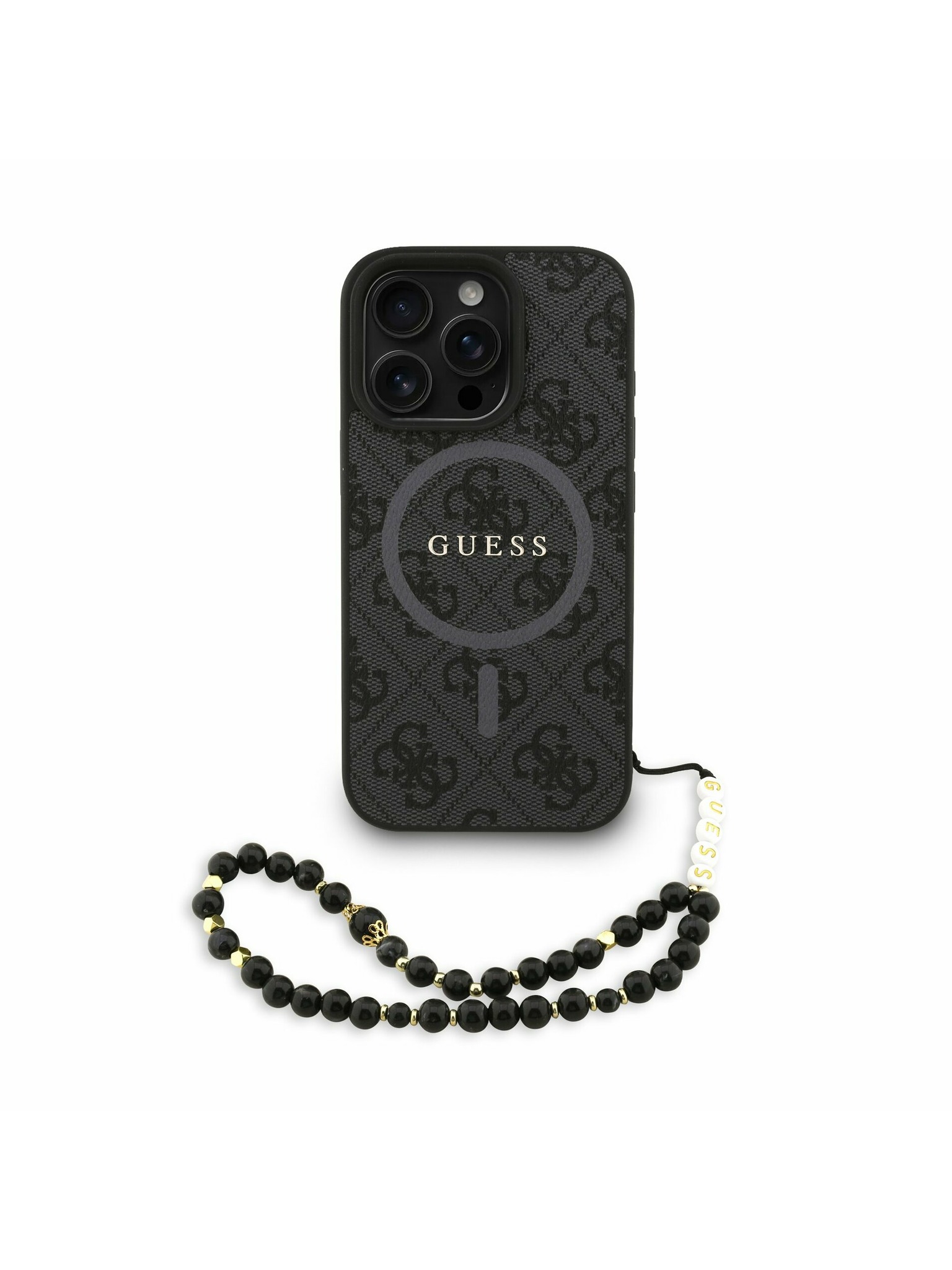 Guess PU кожен 4G цветен пръстен каишка MagSafe заден калъф за iPhone 16 Pro Max черен