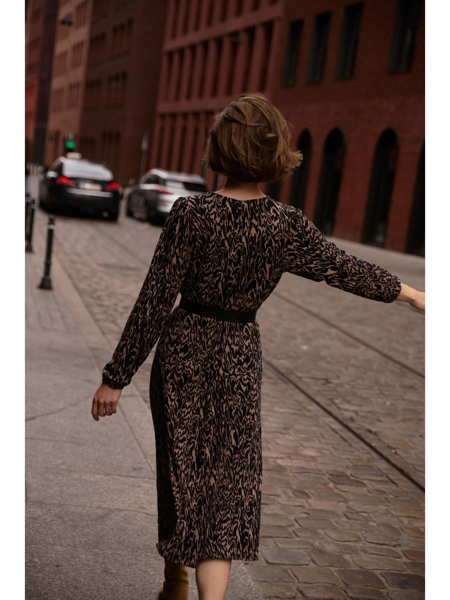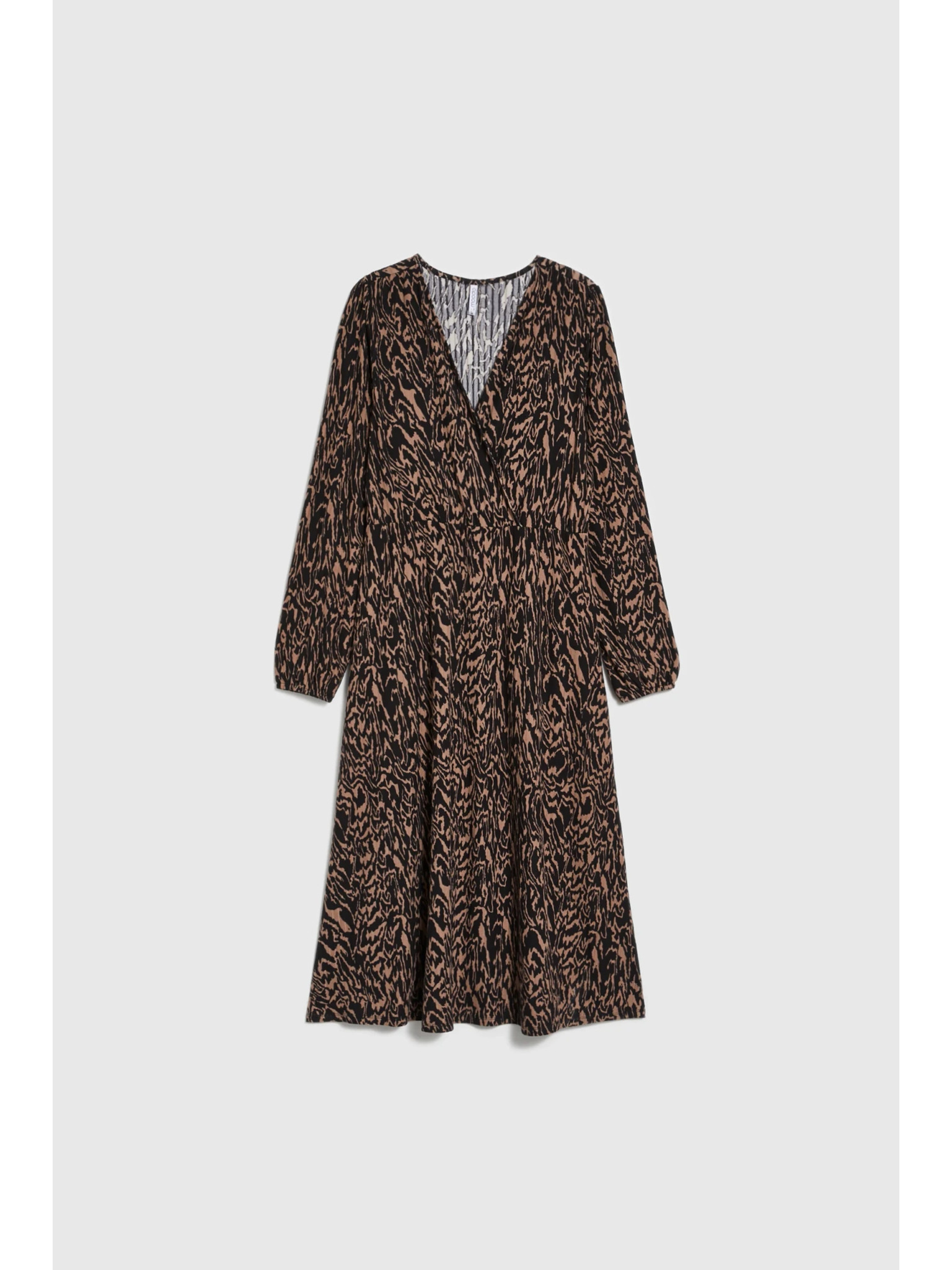 Миди рокля с акцентиран талия, набори, V-образно деколте и животински принт Marks & Spencer бежов