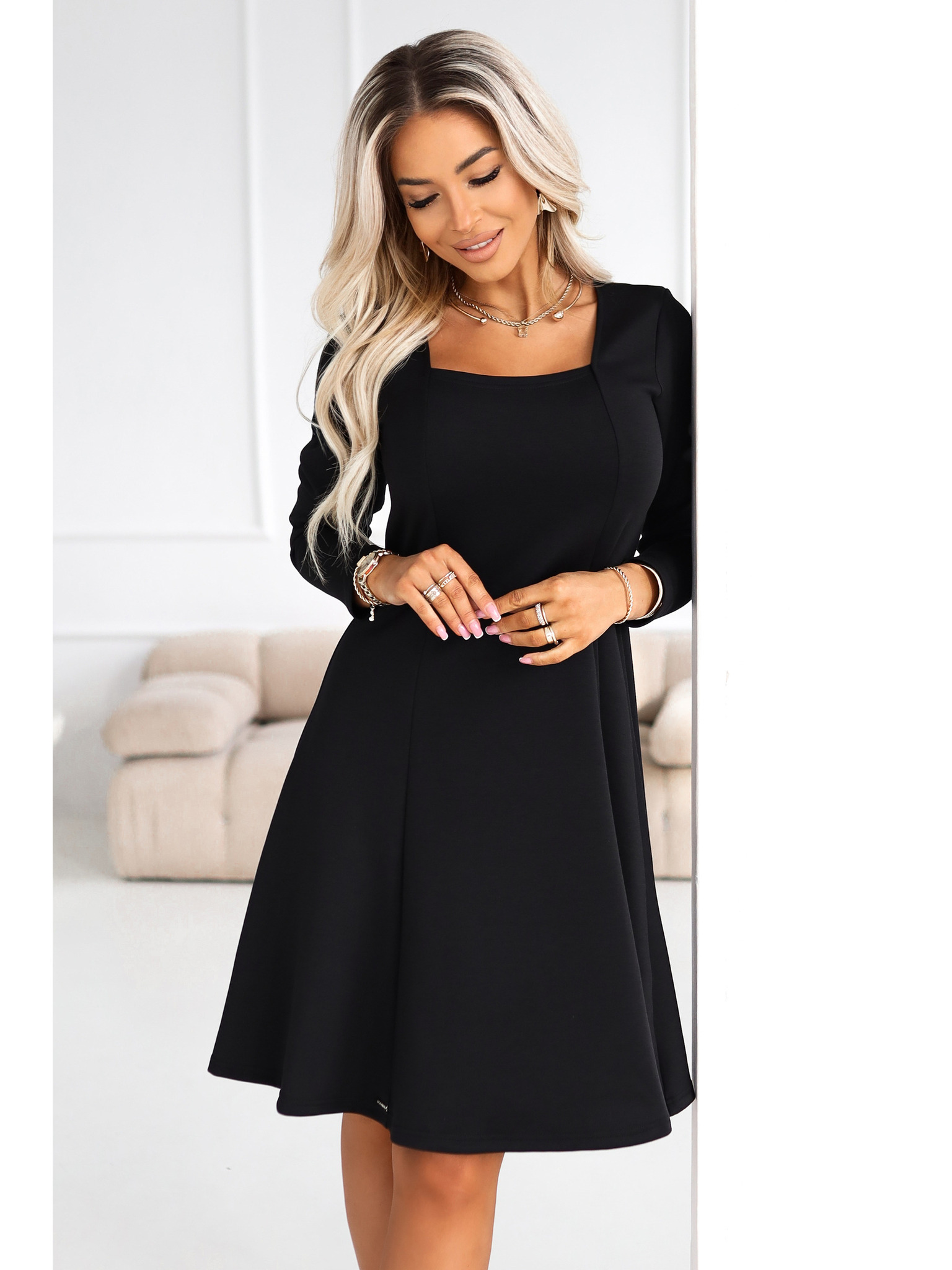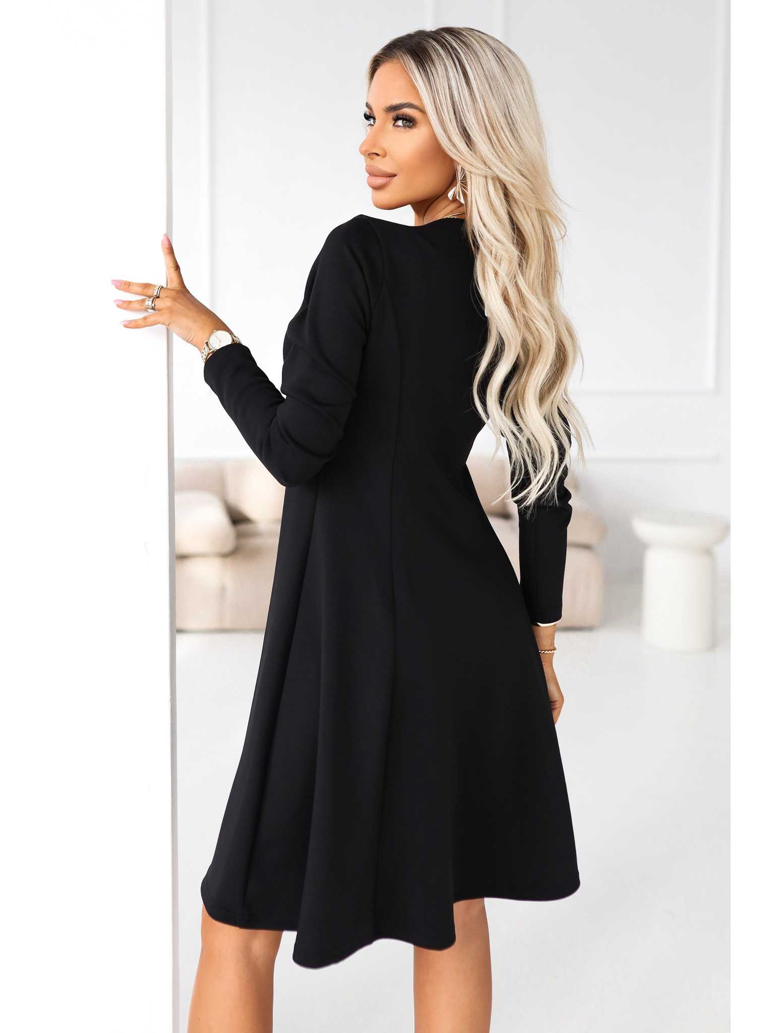 Елегантни миди рокля с прехвърлящо се деколте и тюлени ръкави - черна