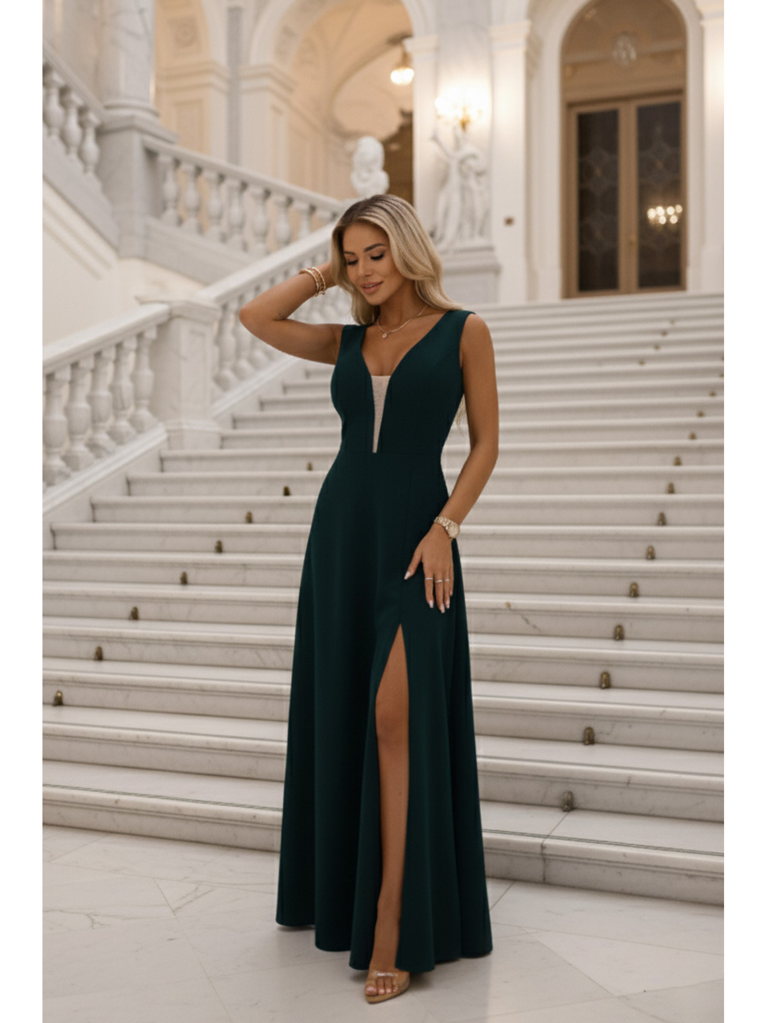 IRINA Блестяща дълга рокля с брокат, V-образно деколте и цепка - бутилково зелено