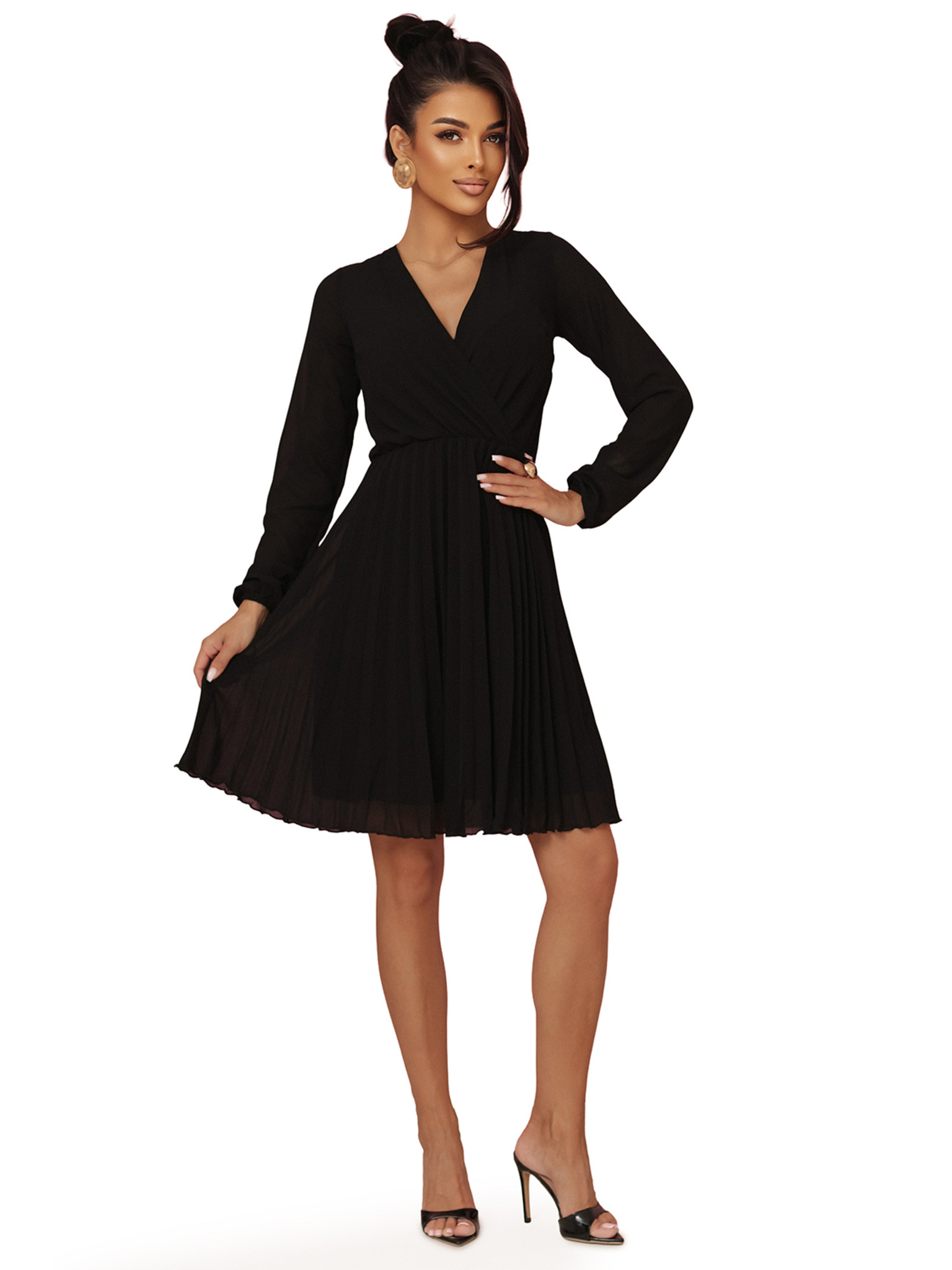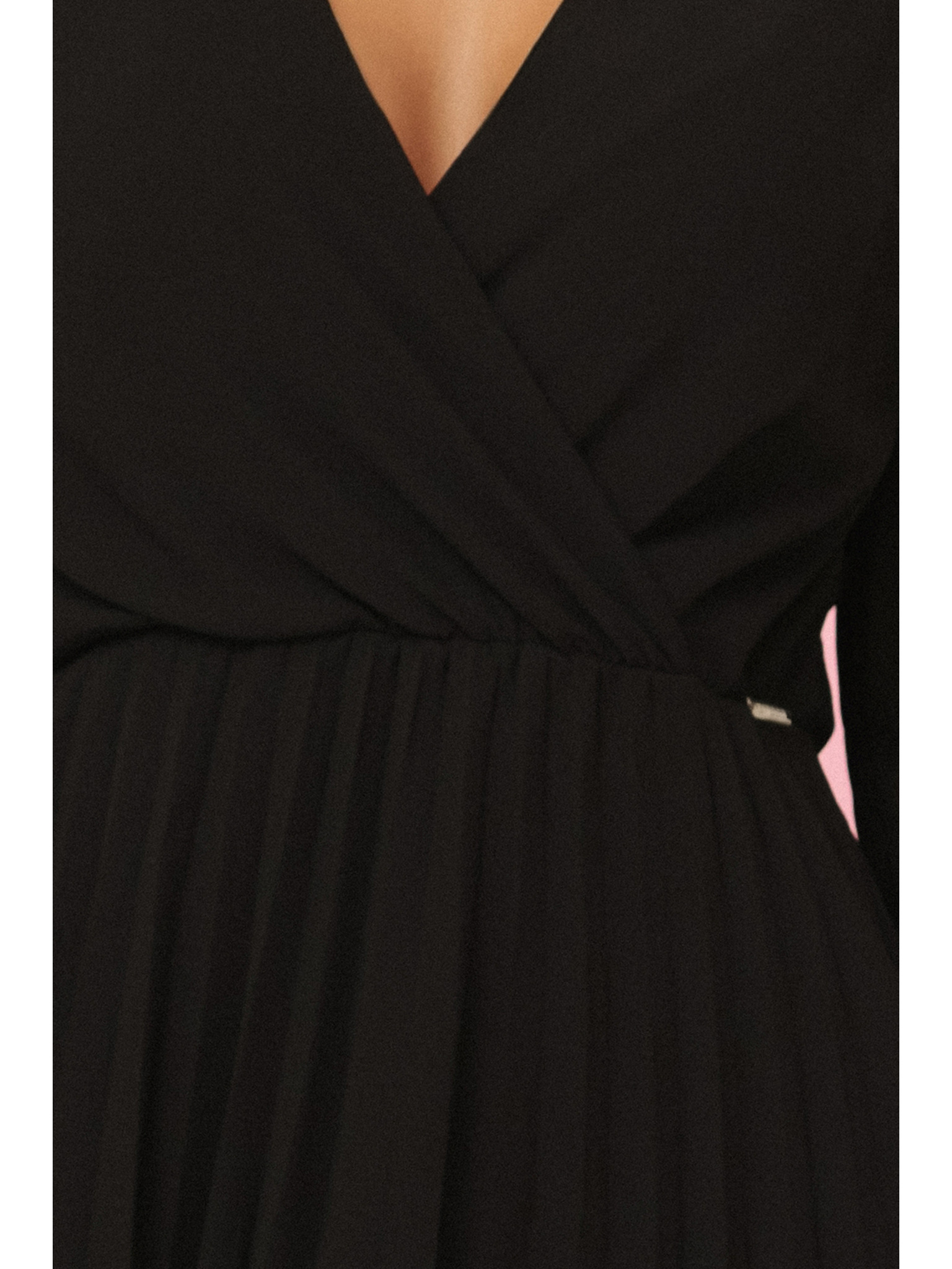 Елегантни миди рокля с прехвърлящо се деколте и тюлени ръкави - черна