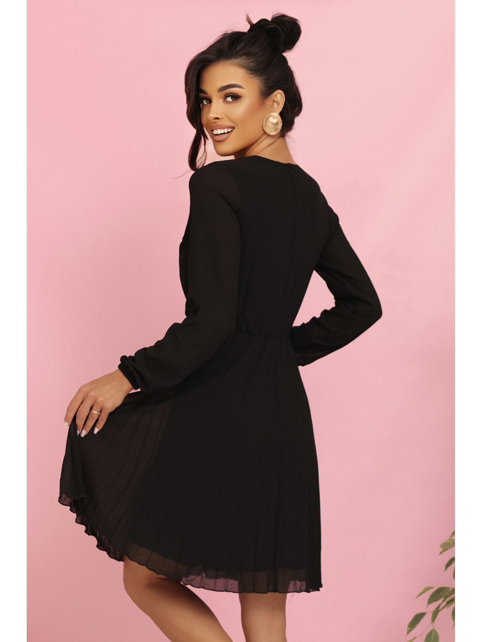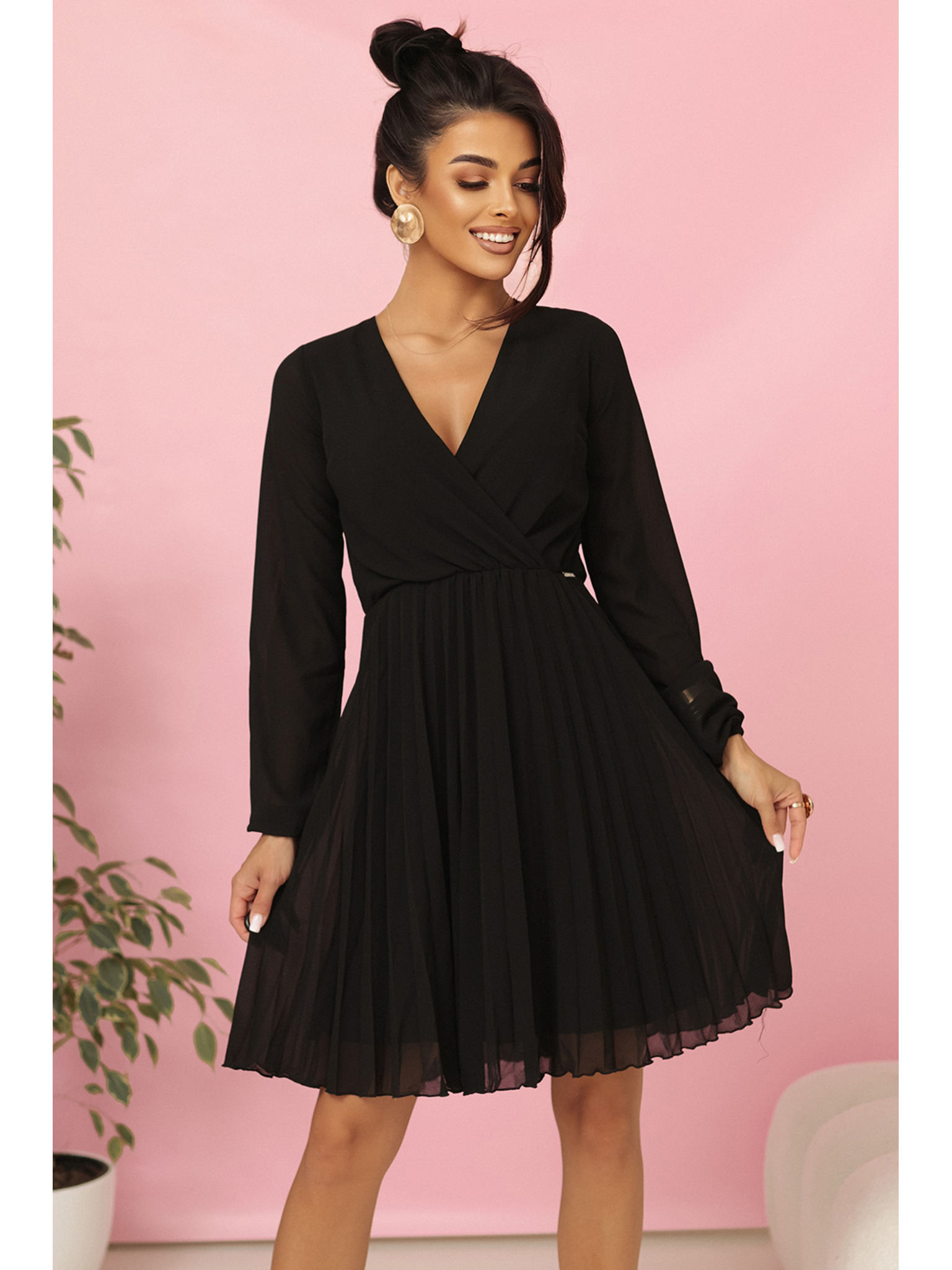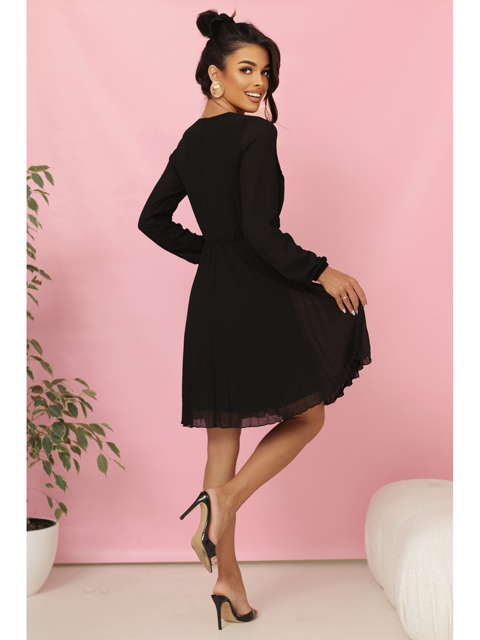 IVANA удобни трапецовидни рокля с деколте и дълъг ръкав - черна