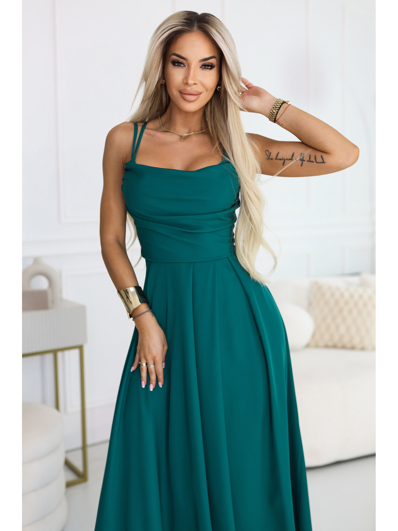 LIDIA дълга рокля с деколте и воланки - зелено