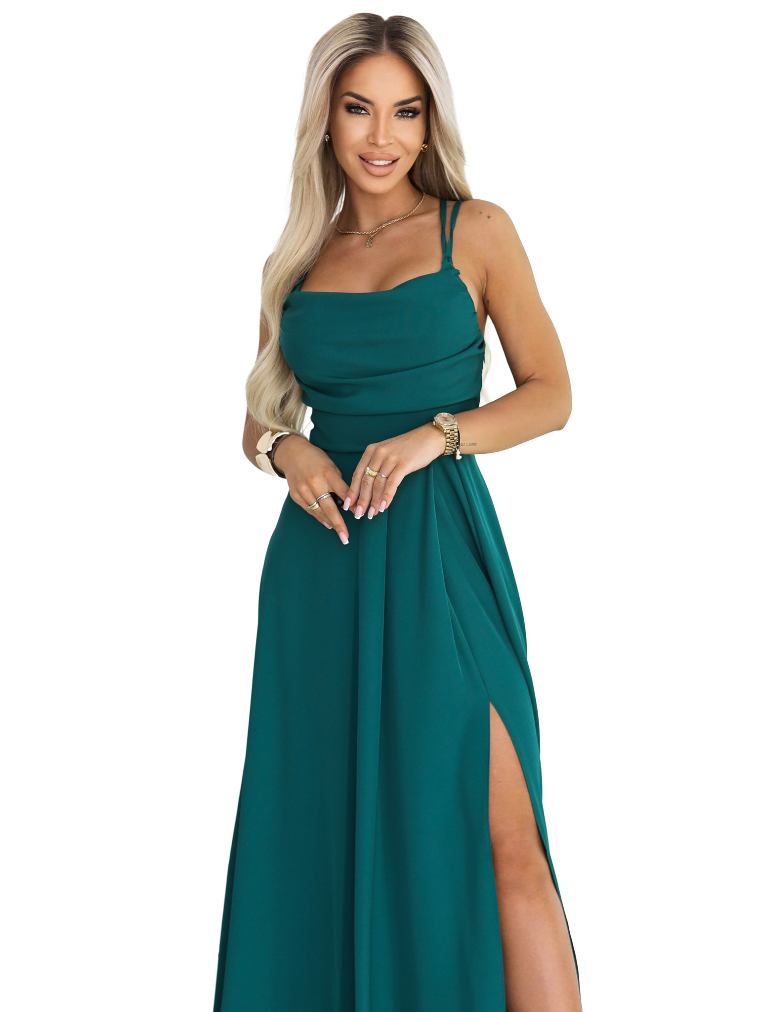 AURELIA дълги рокли с цепка при крачола и диамантено деколте - тъмнозелени