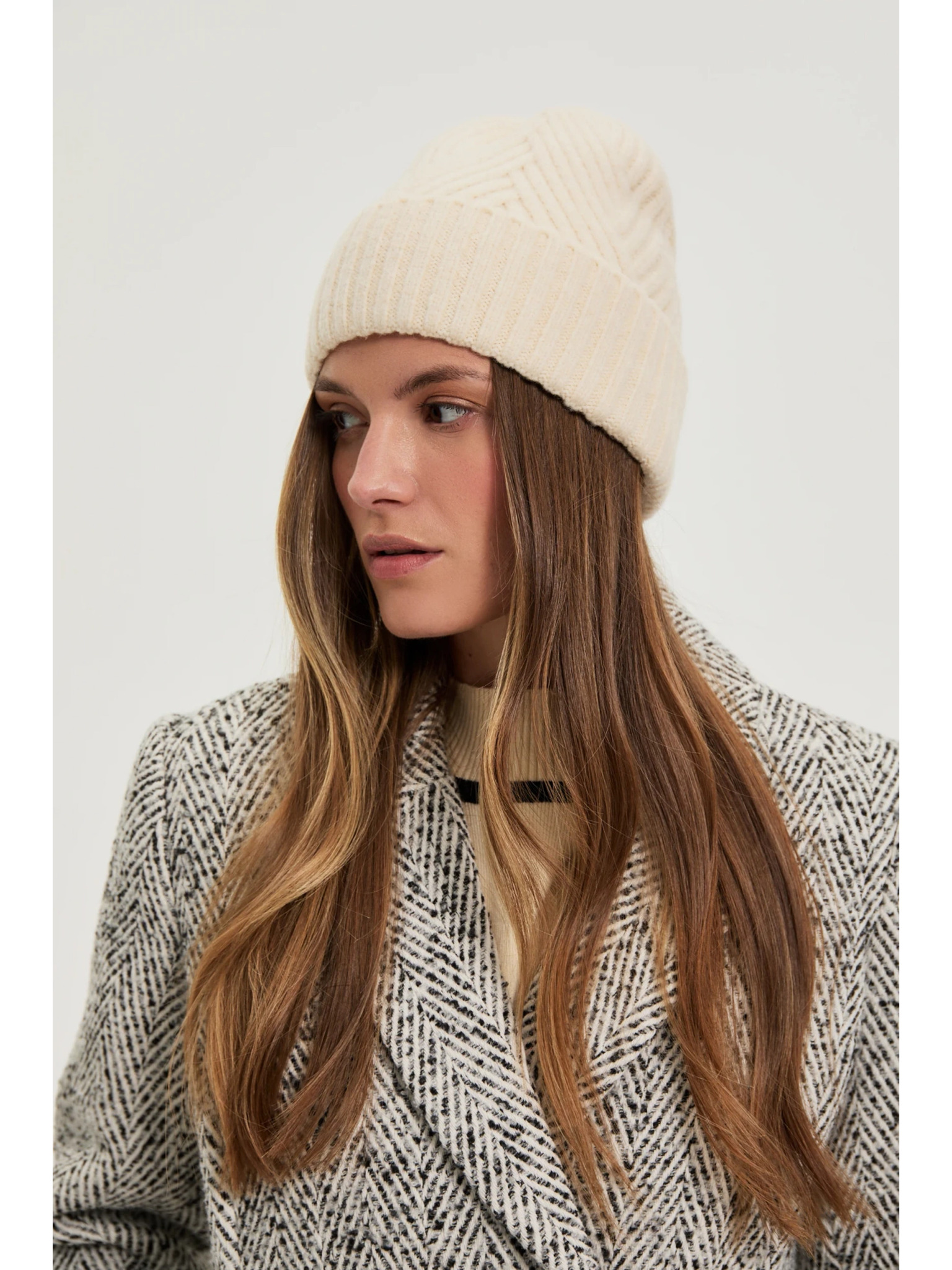Топла бежова шапка с вълнена добавка Moodo