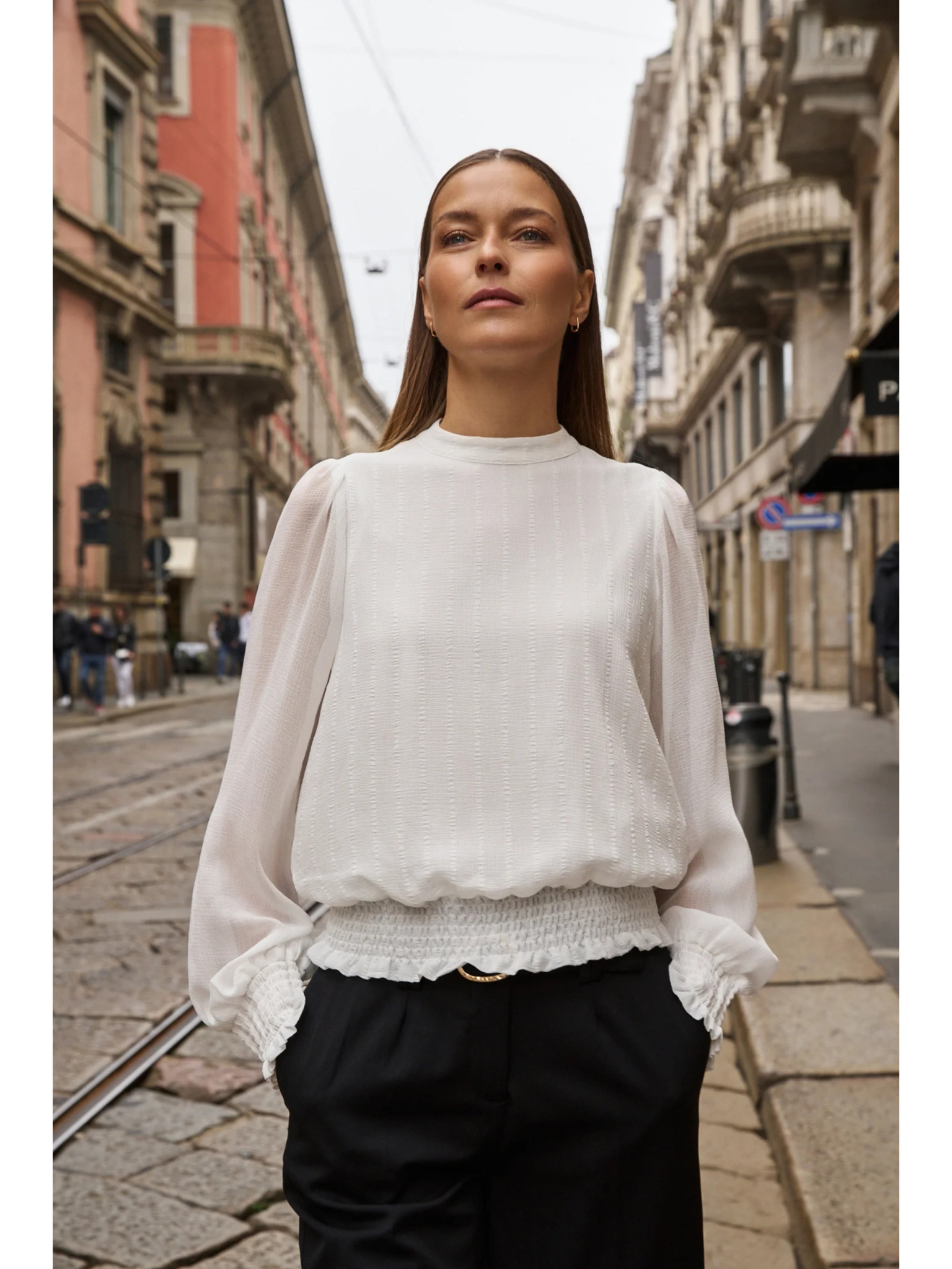 Бяла блуза с подвити ръкави Moodo