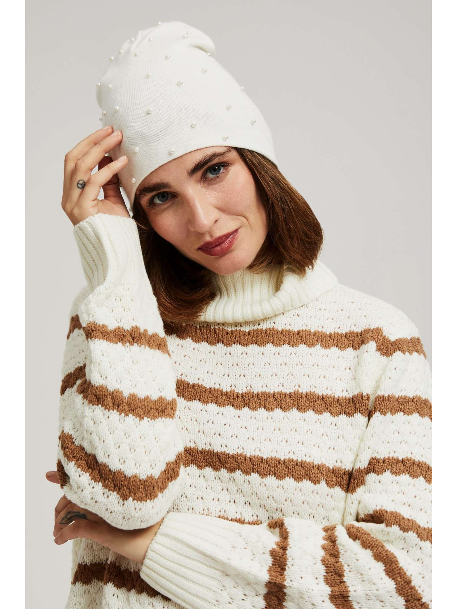 Топла бежова шапка с вълнена добавка Moodo