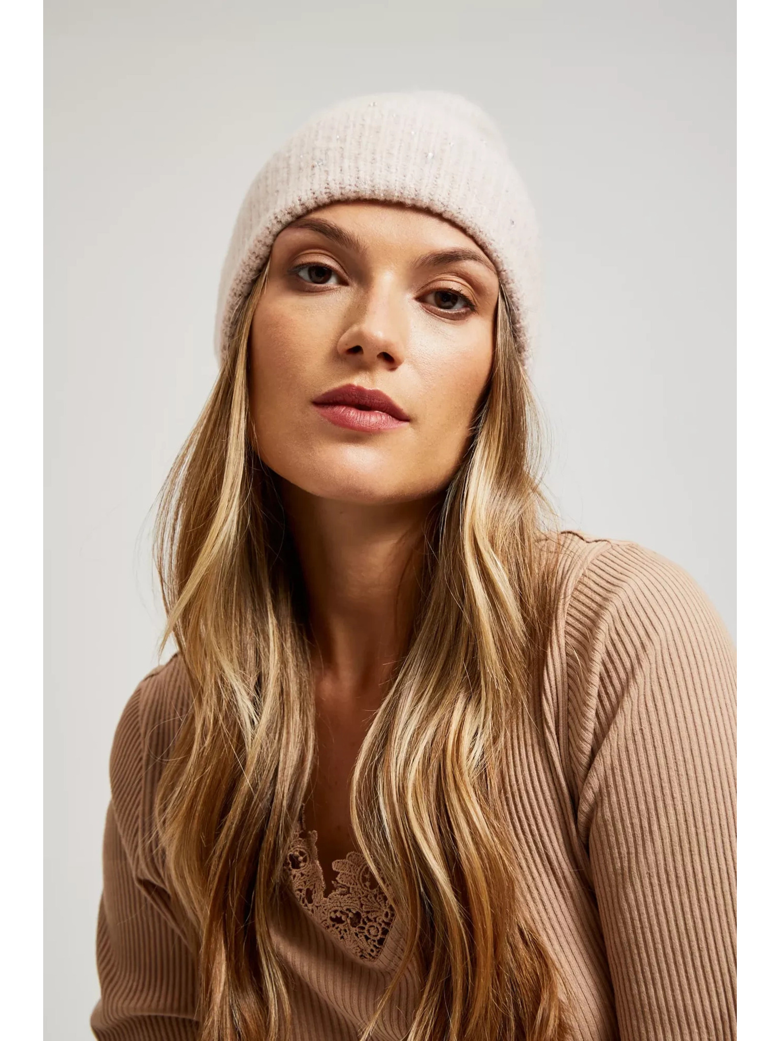 Топла бежова шапка с вълнена добавка Moodo