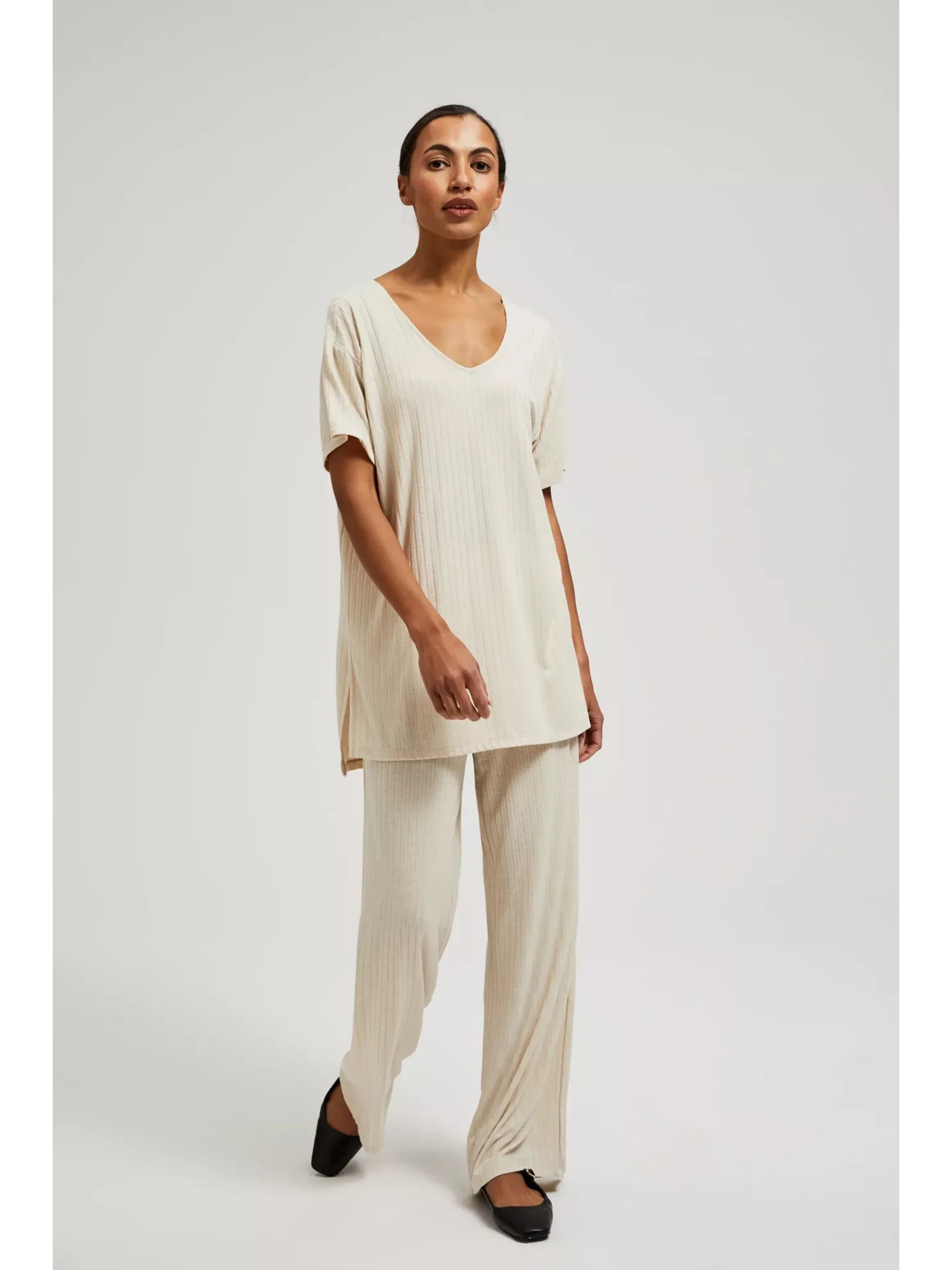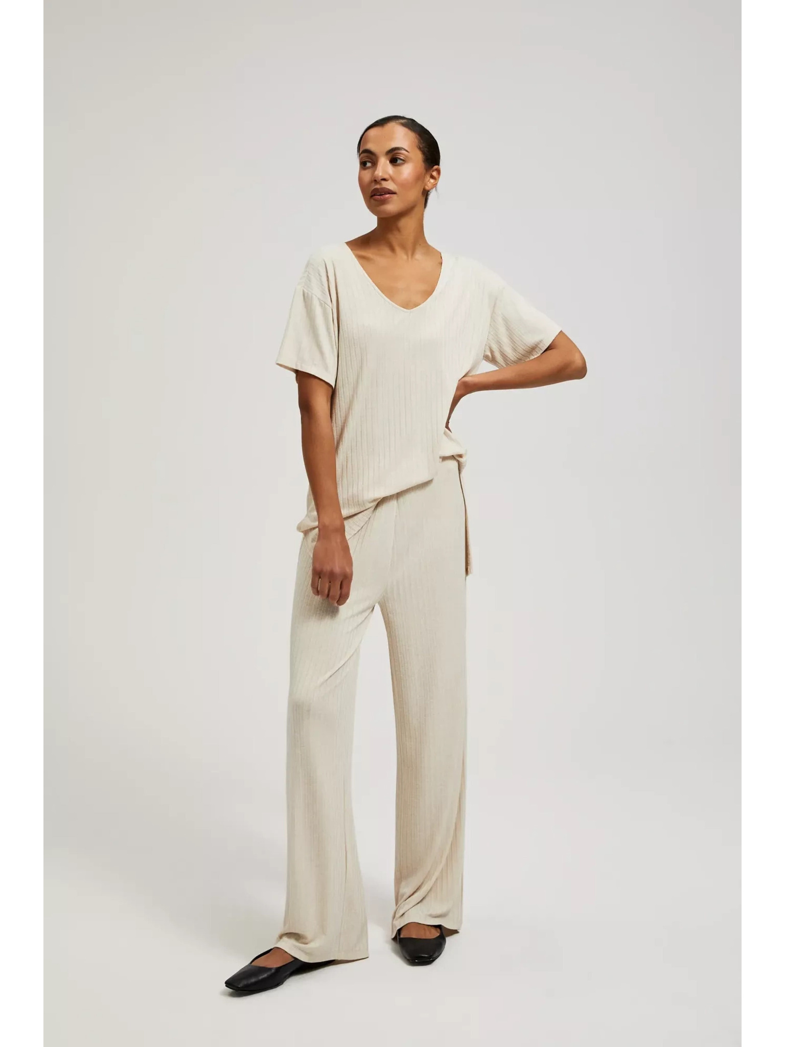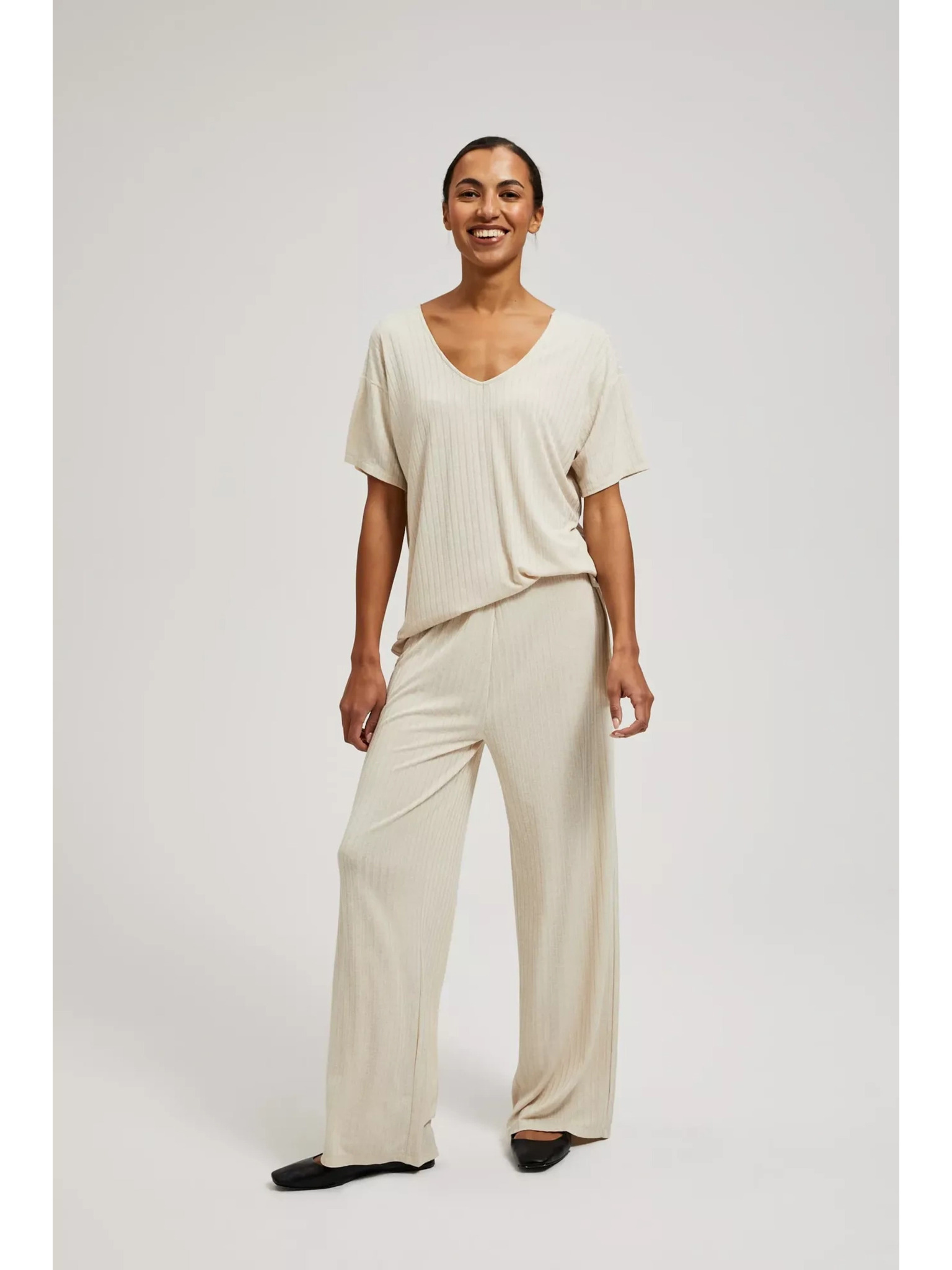 Бежови панталони от ребрест трикотаж Moodo