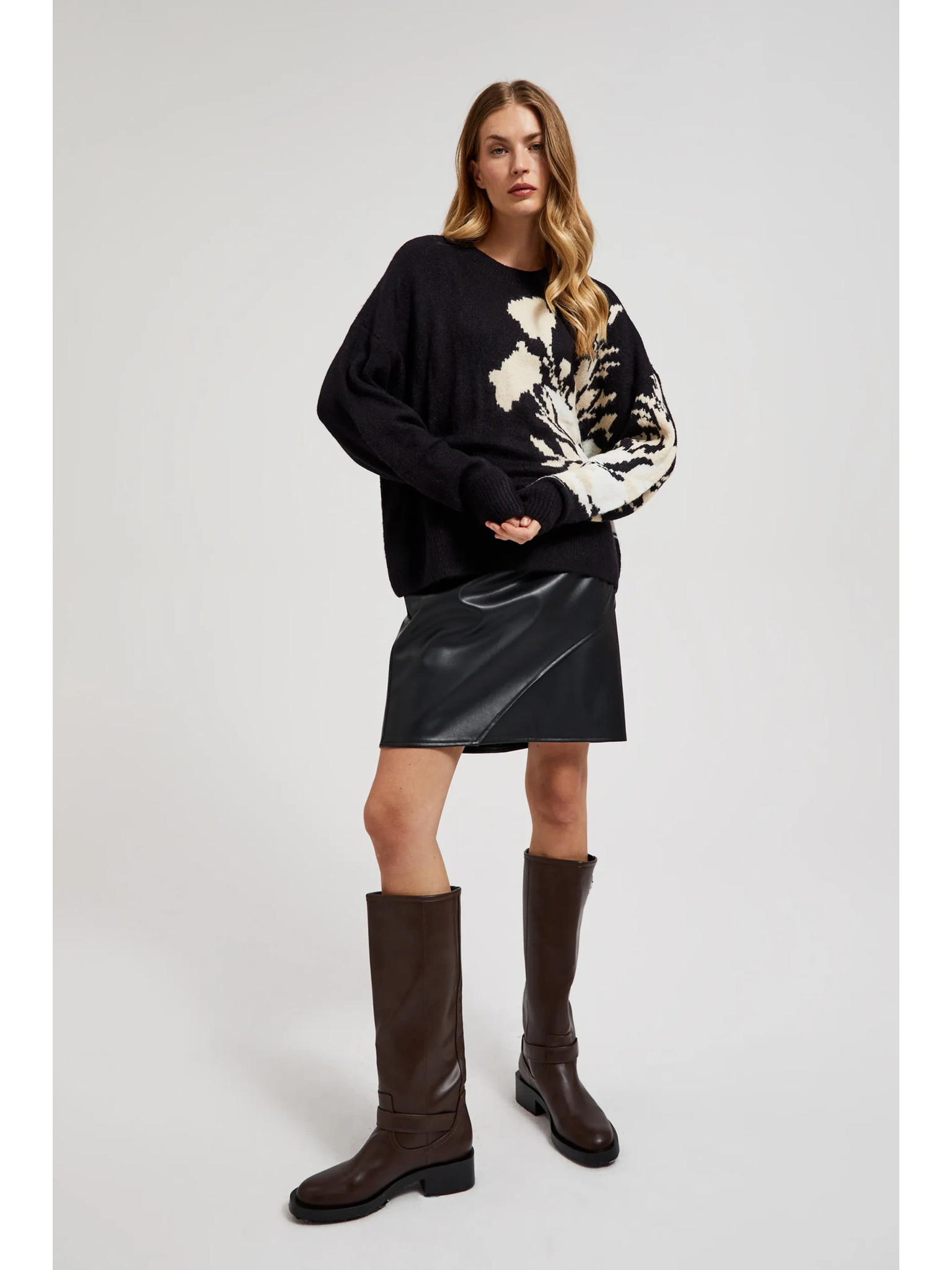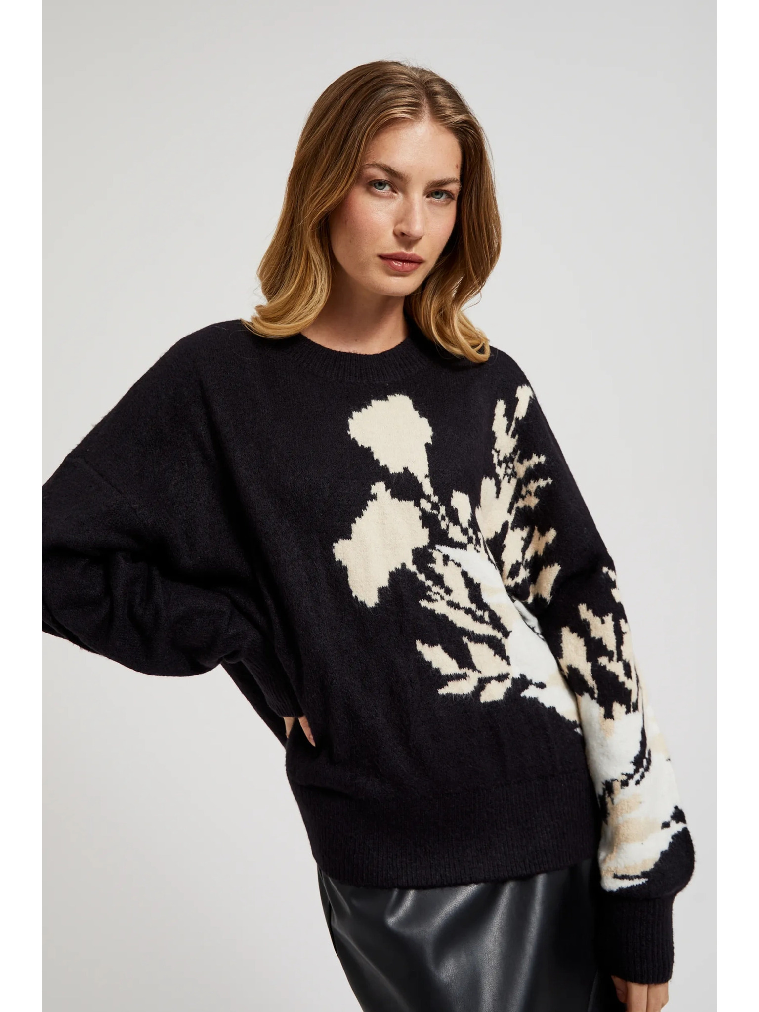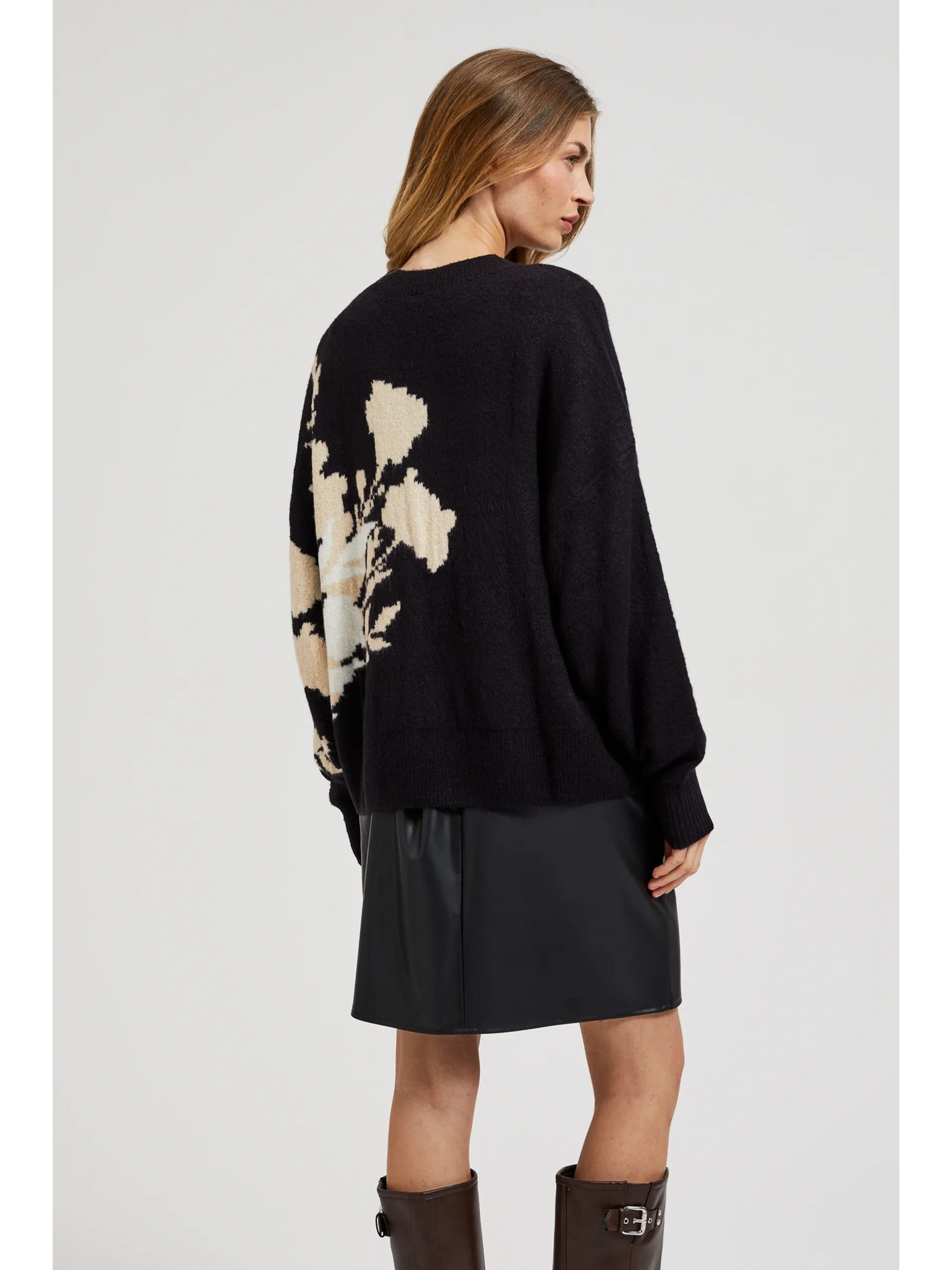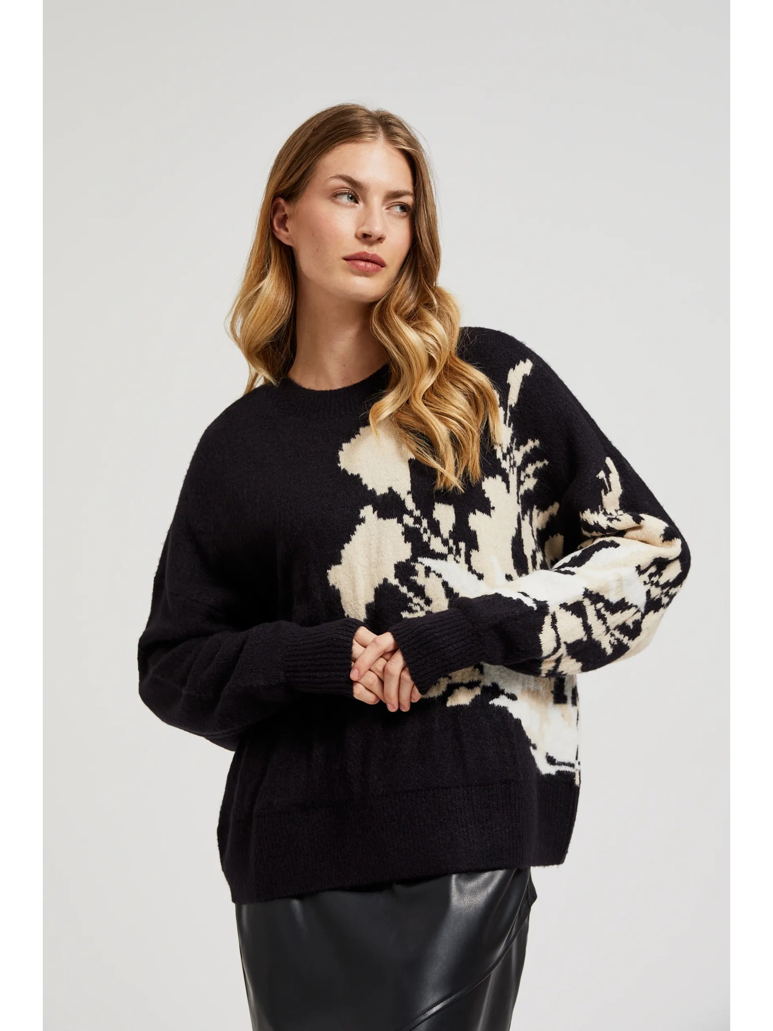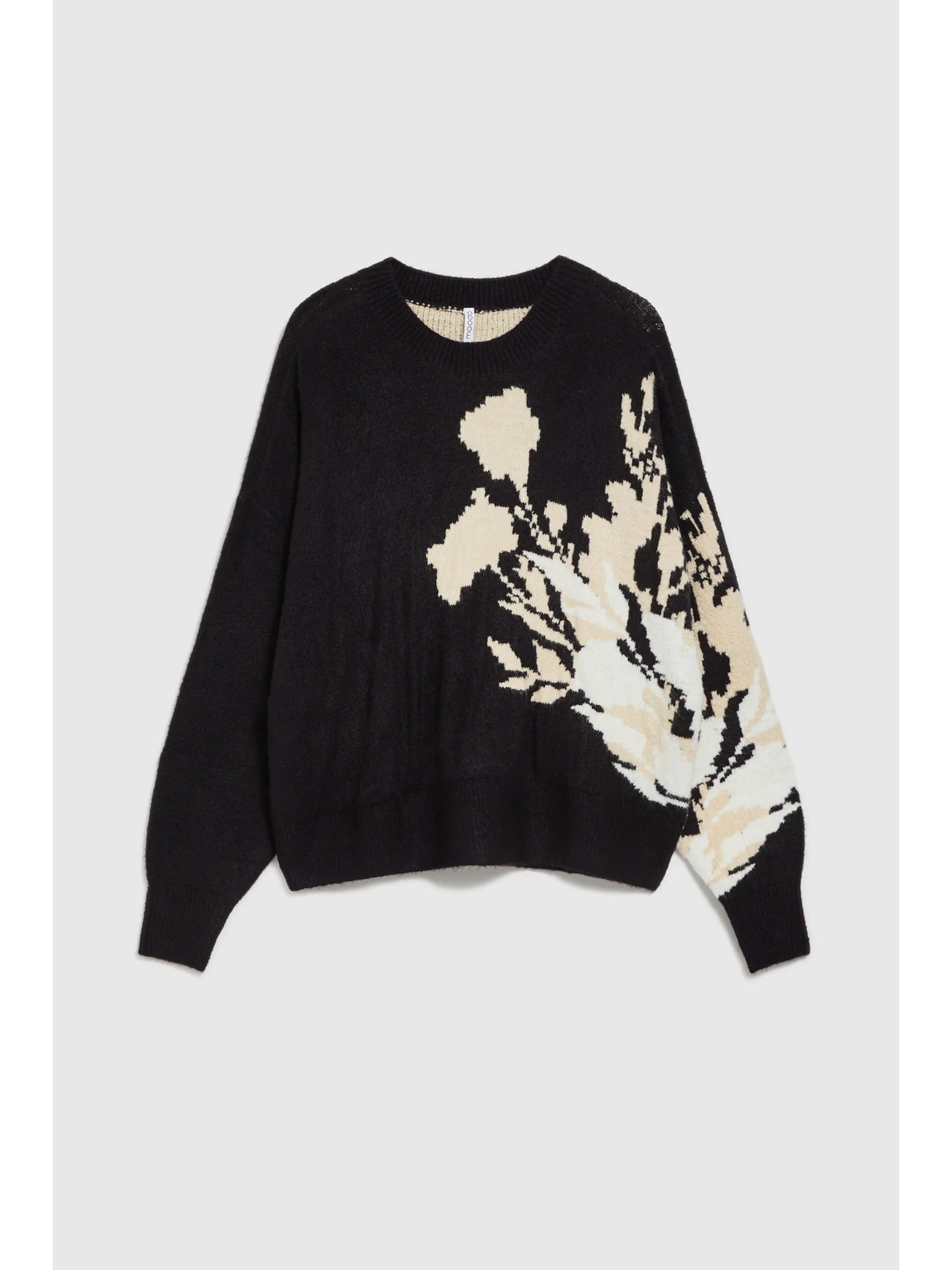 Черен пуловер с десен и свободен силует Moodo