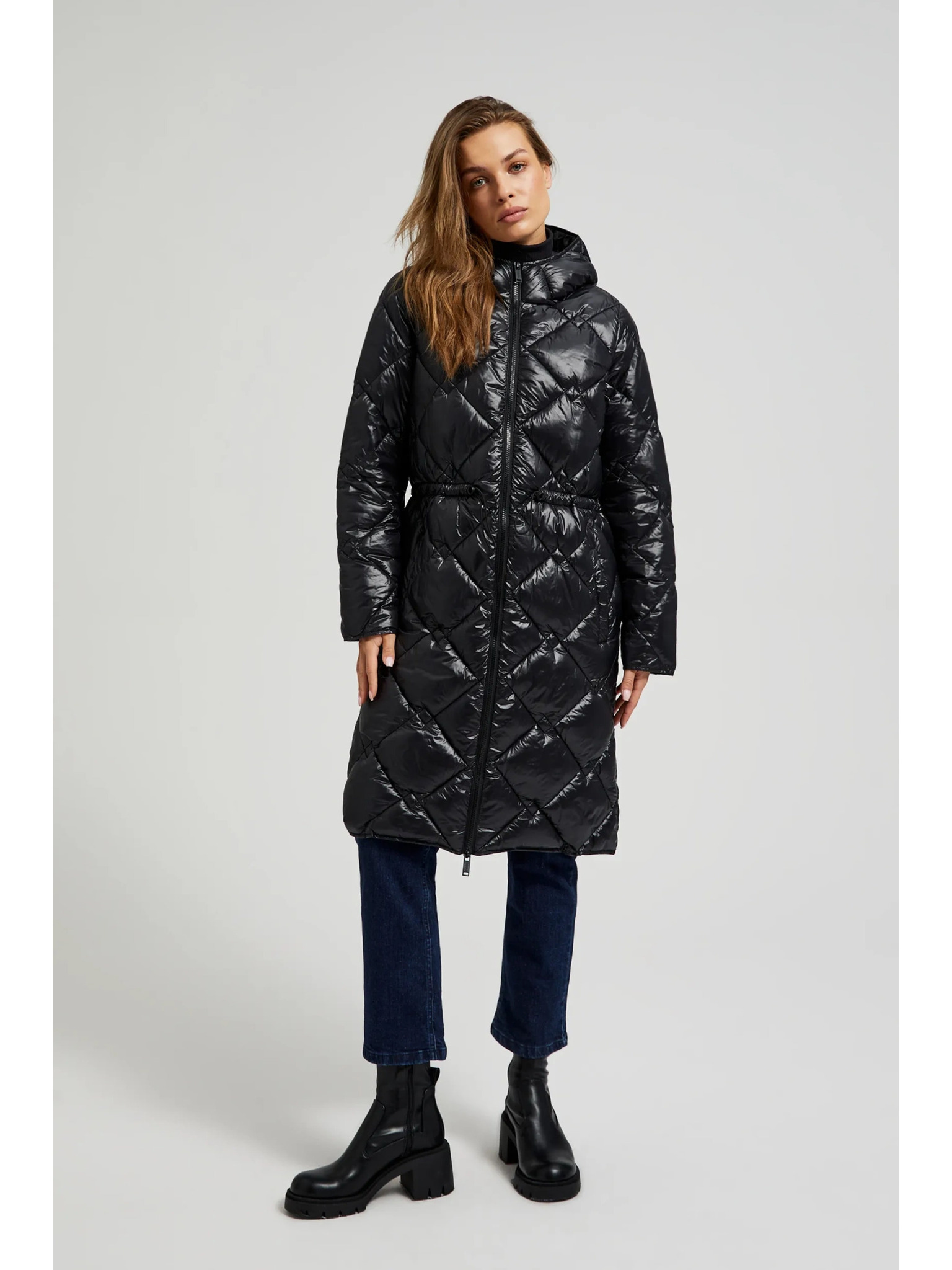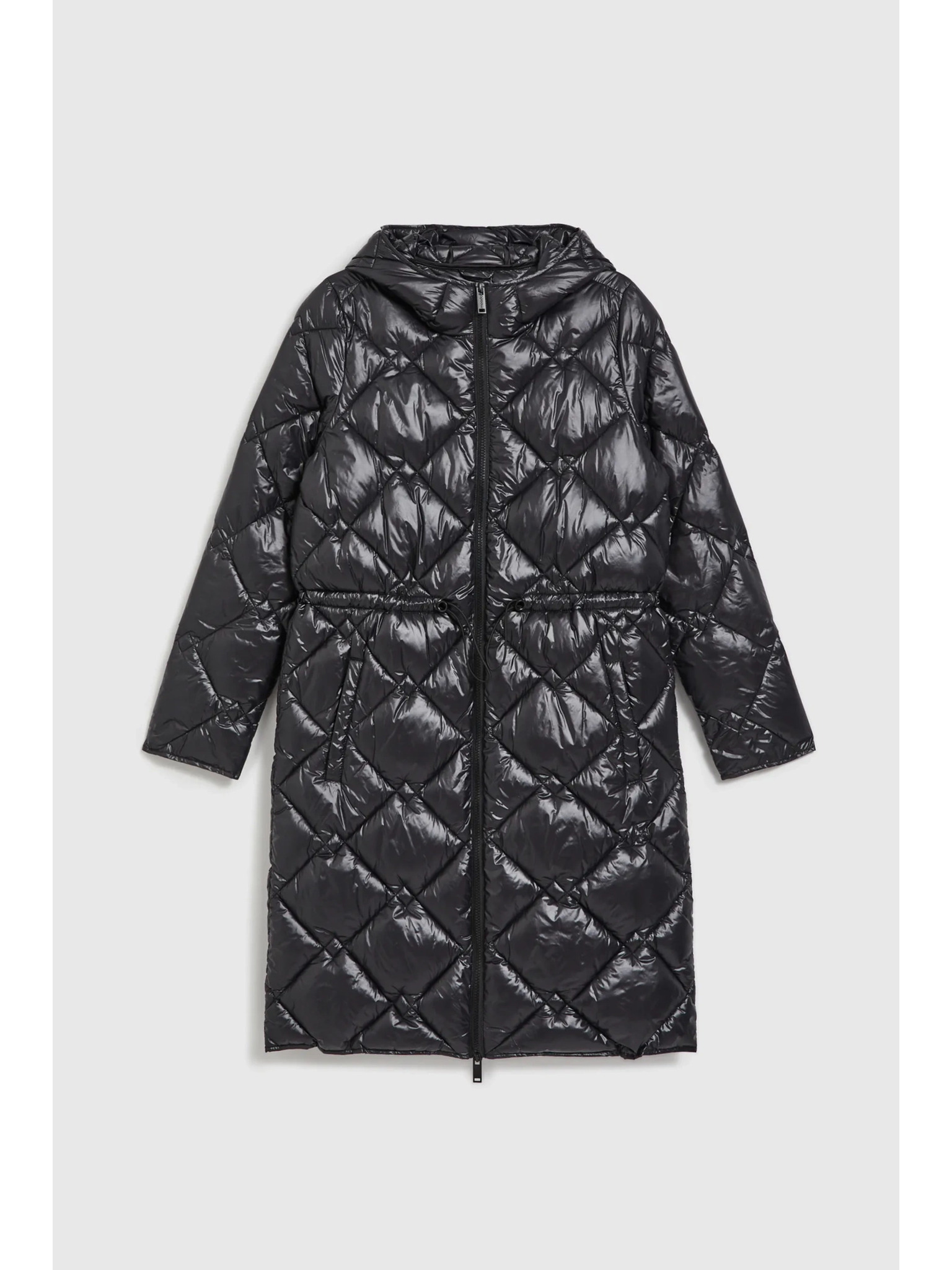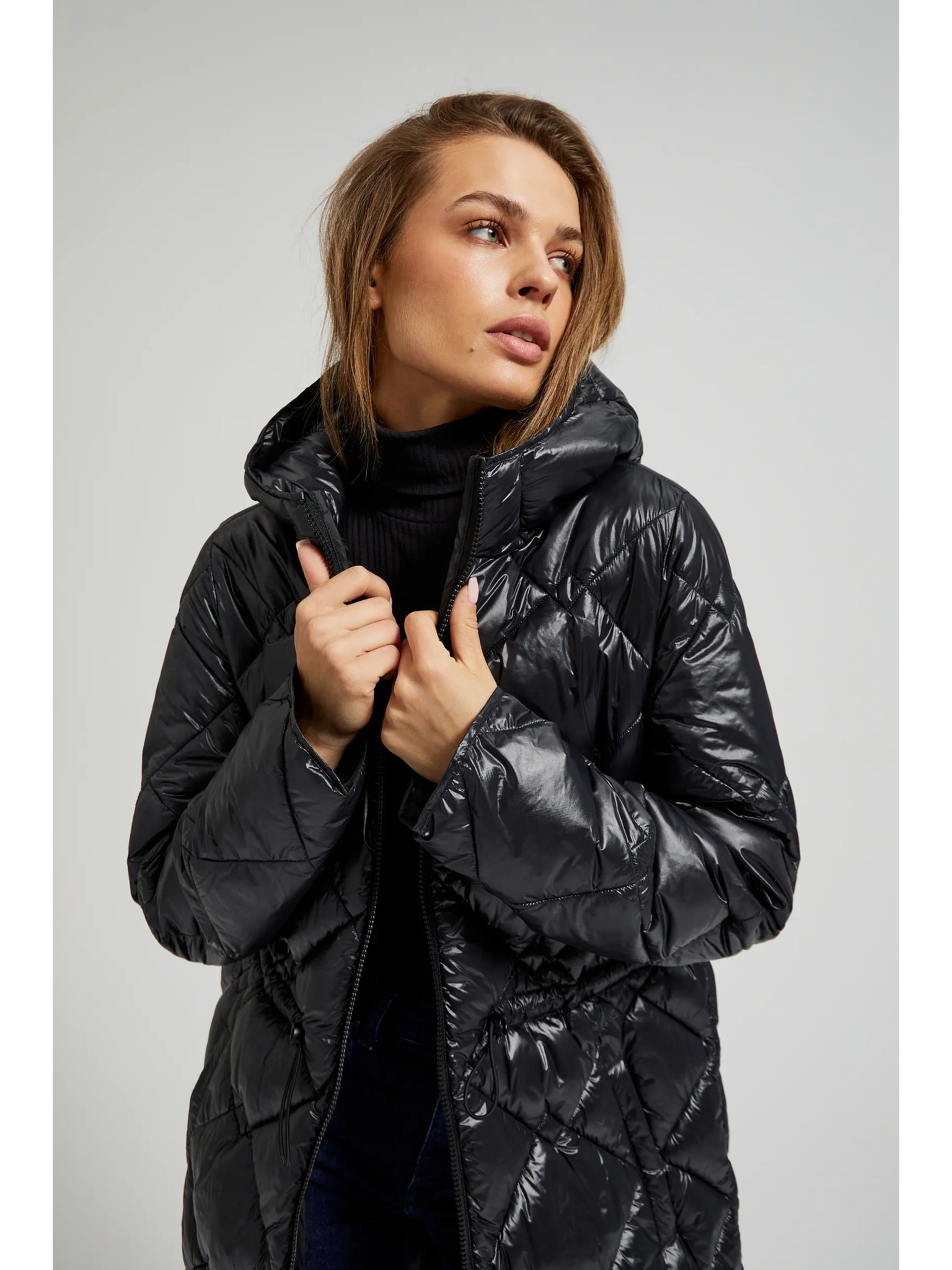 Дълго стегнато яке с качулка в черно Moodo