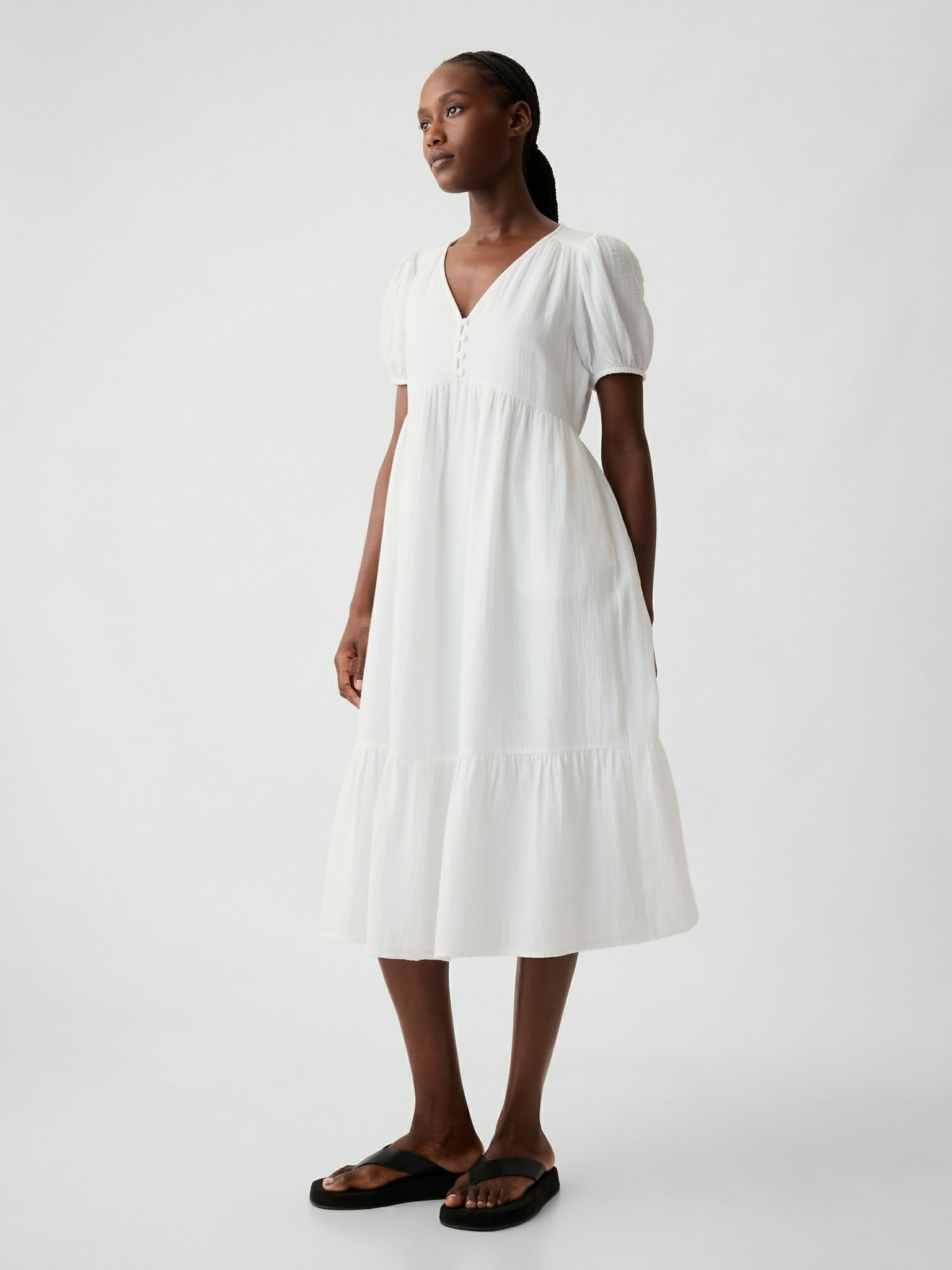 Бели миди рокли с воланчета на деколтето Moodo