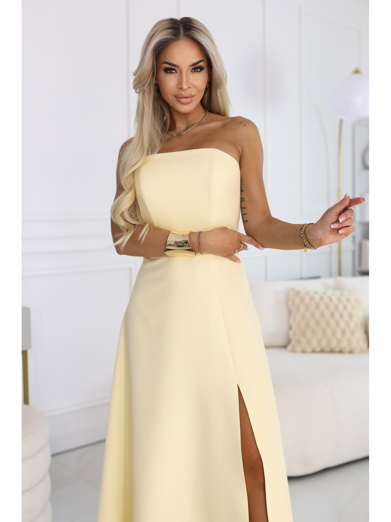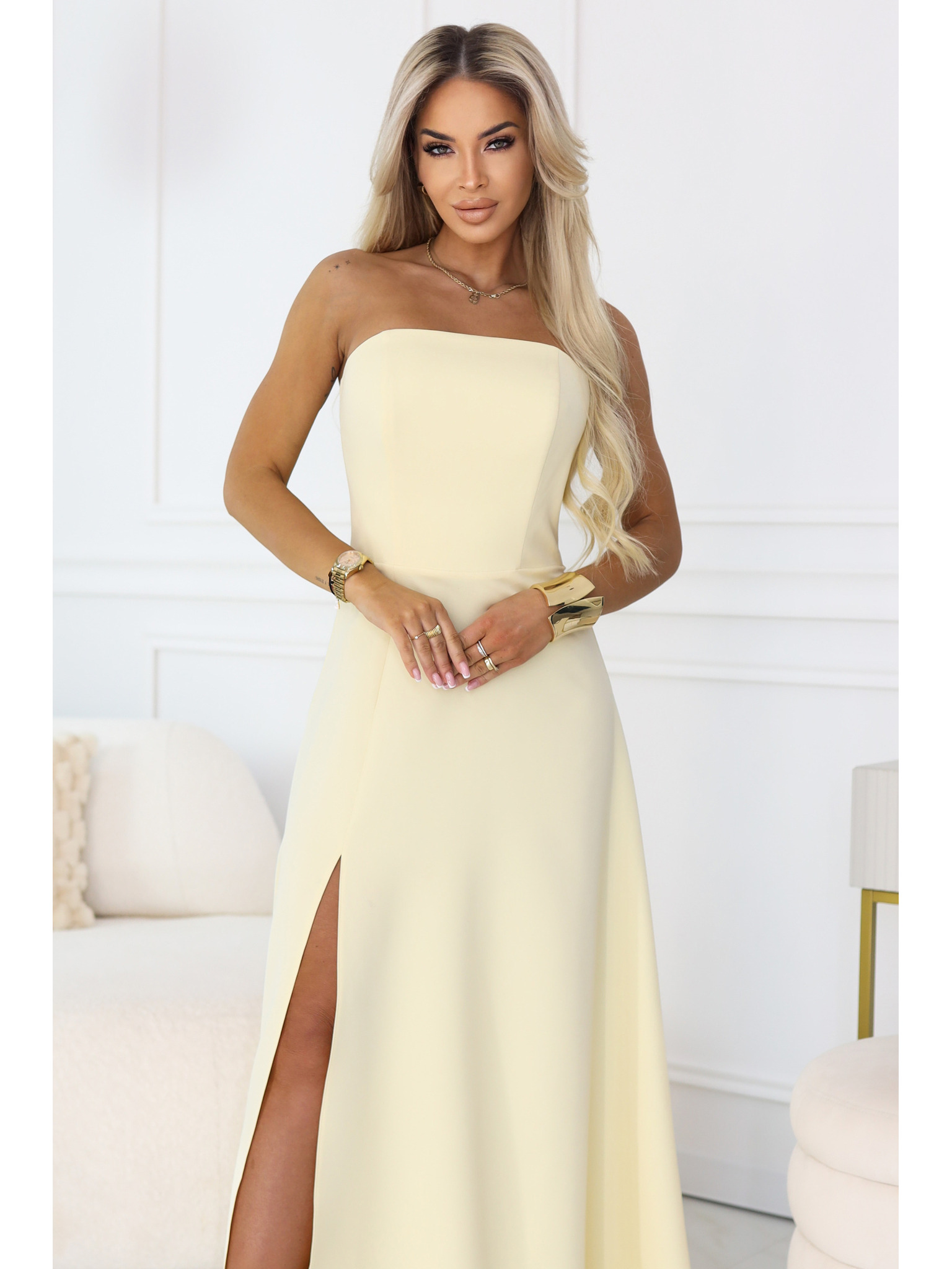 JENNIFER дълги рокли с цепка при крачола, ръкави и деколте - бежови