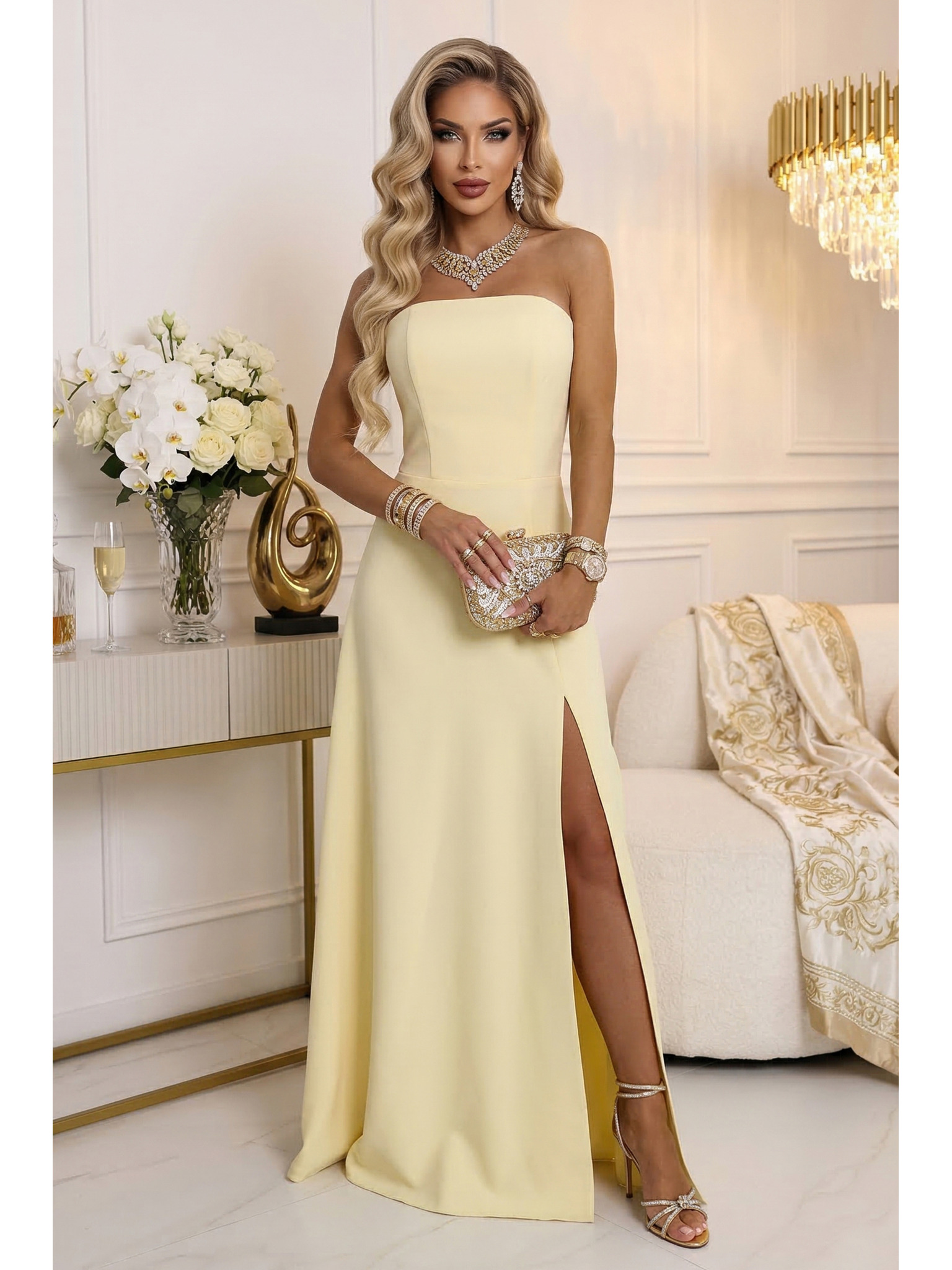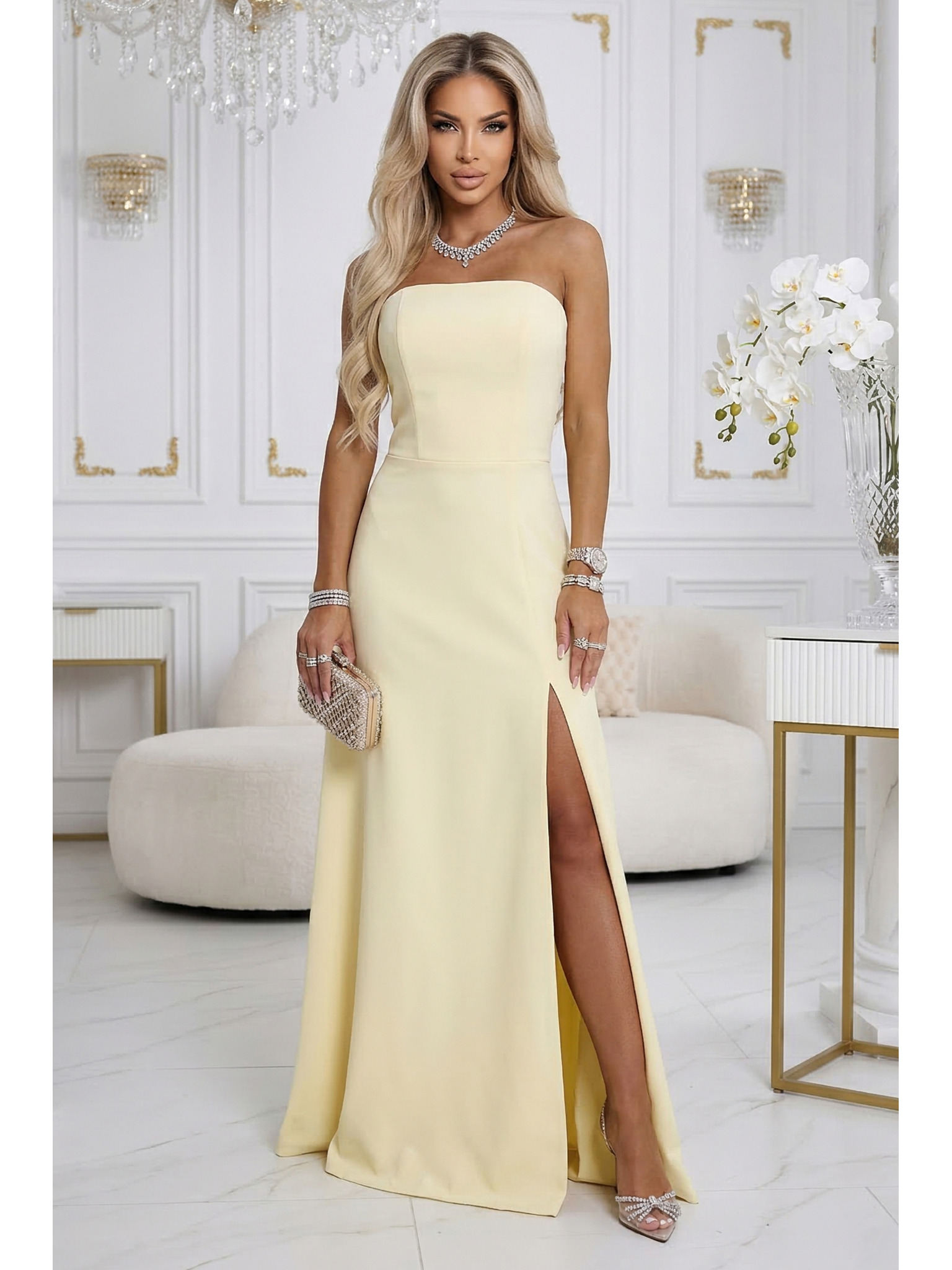 CRYSTAL сатенена дълга рокля с деколте - мока мус