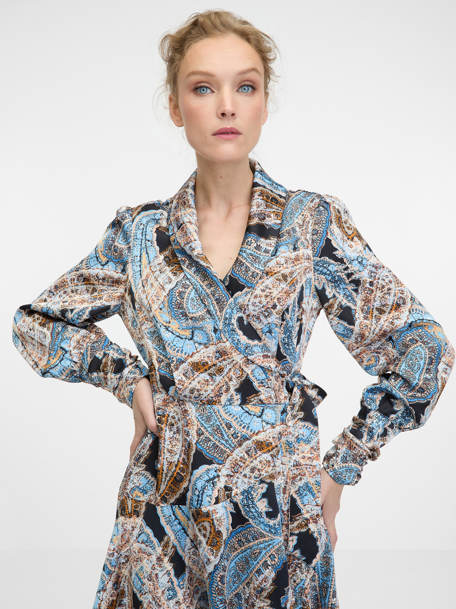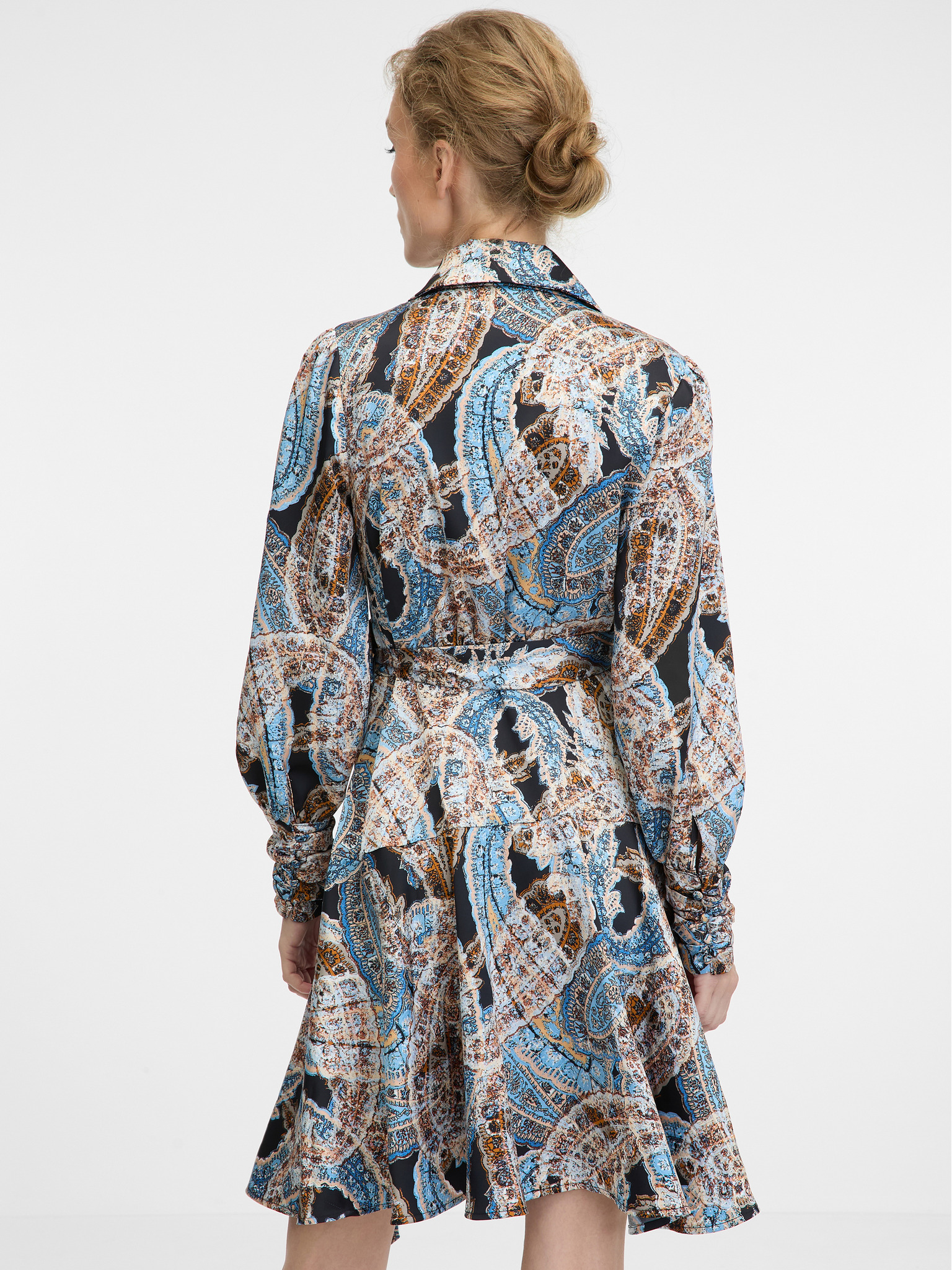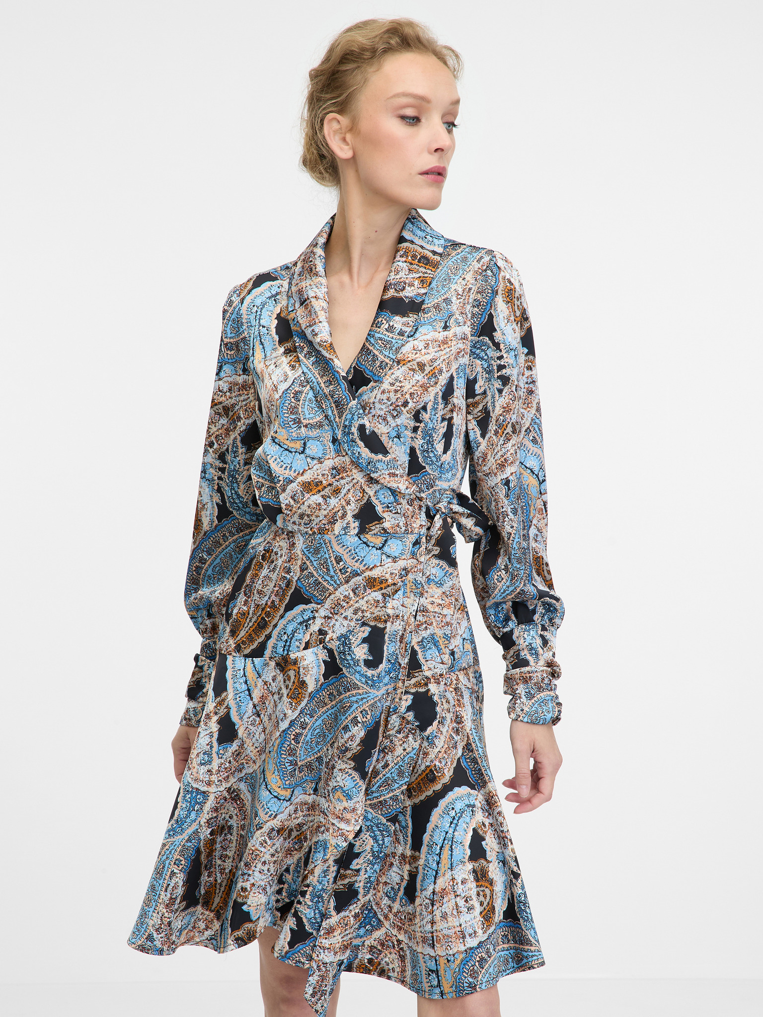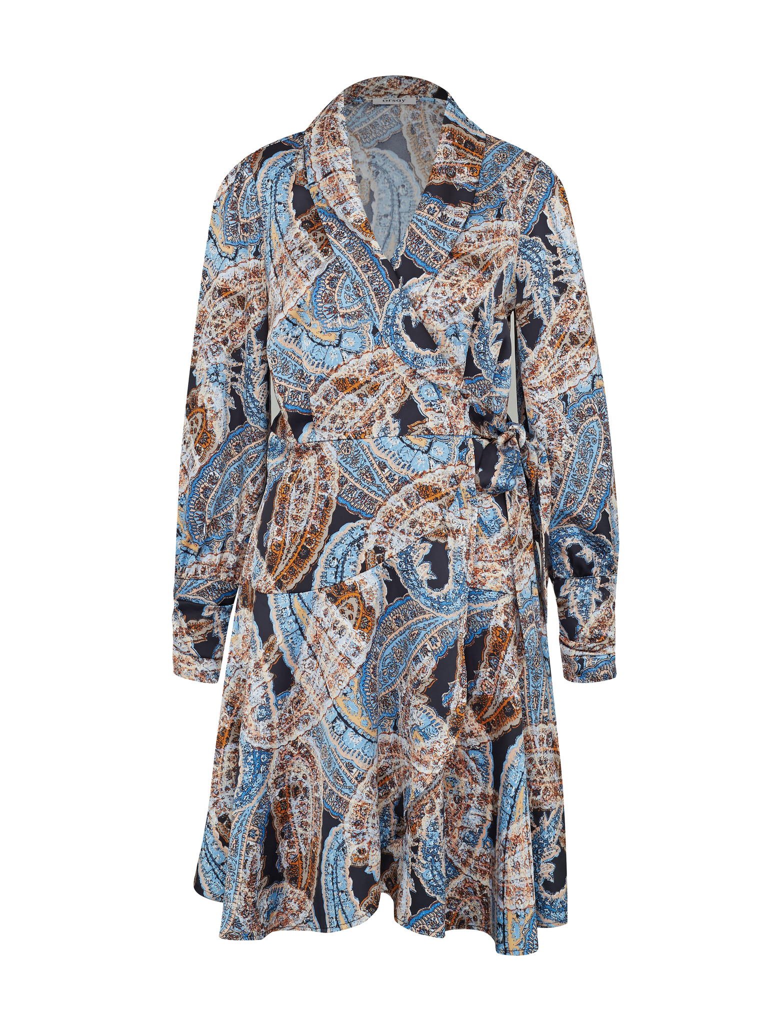 Синя дамска сатенена миди рокля с десен ORSAY