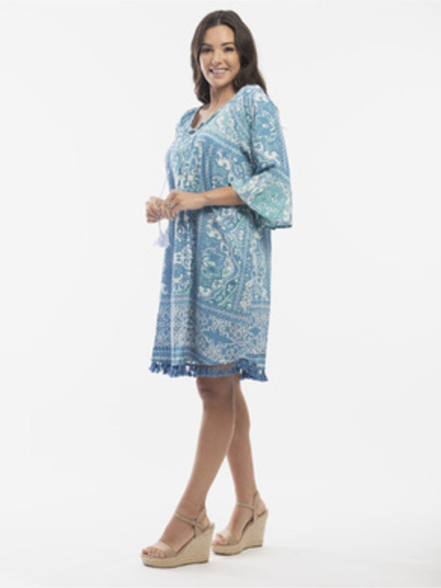 Бяло-светлосиньо дамско шарено двустранно платье