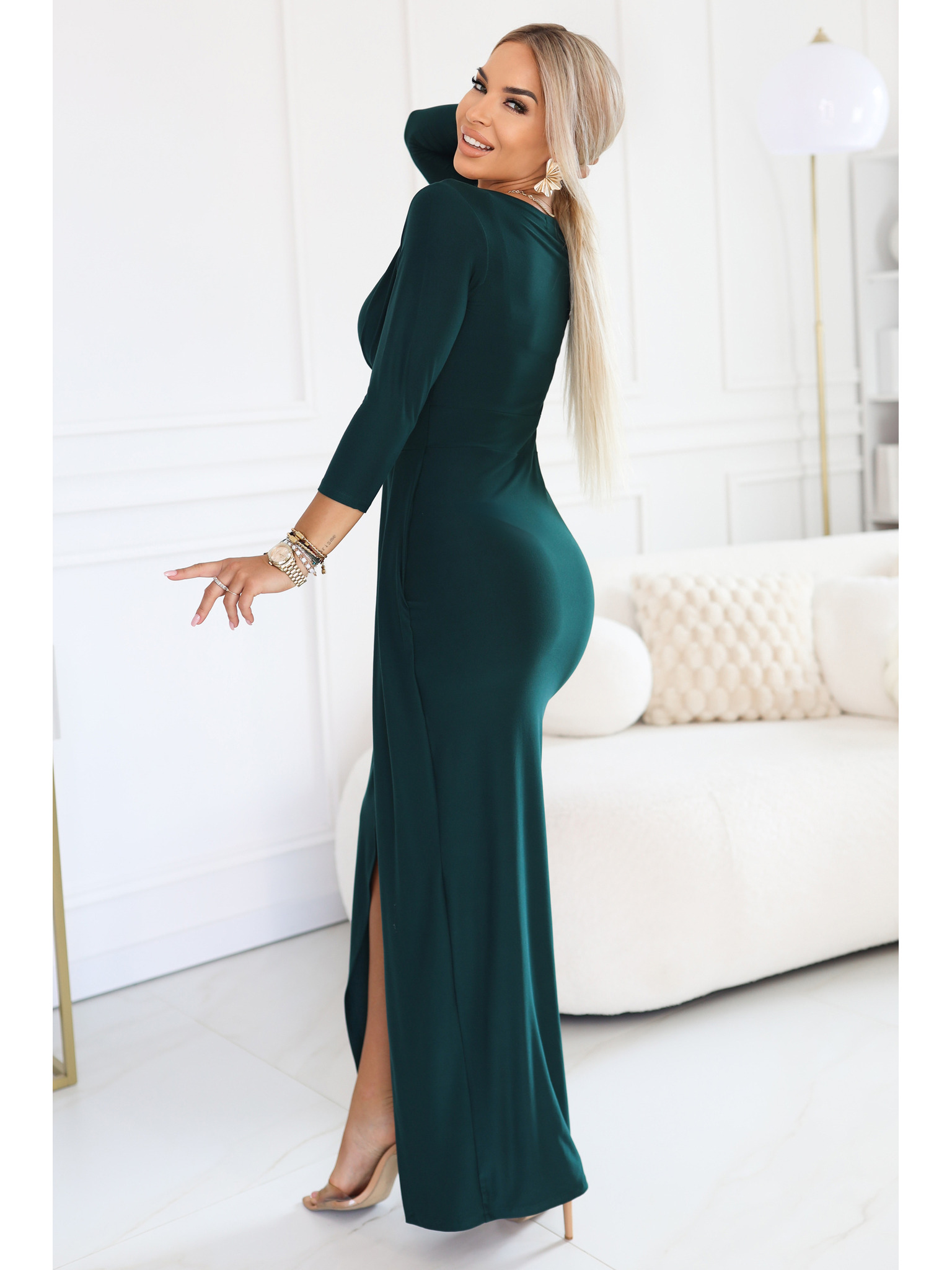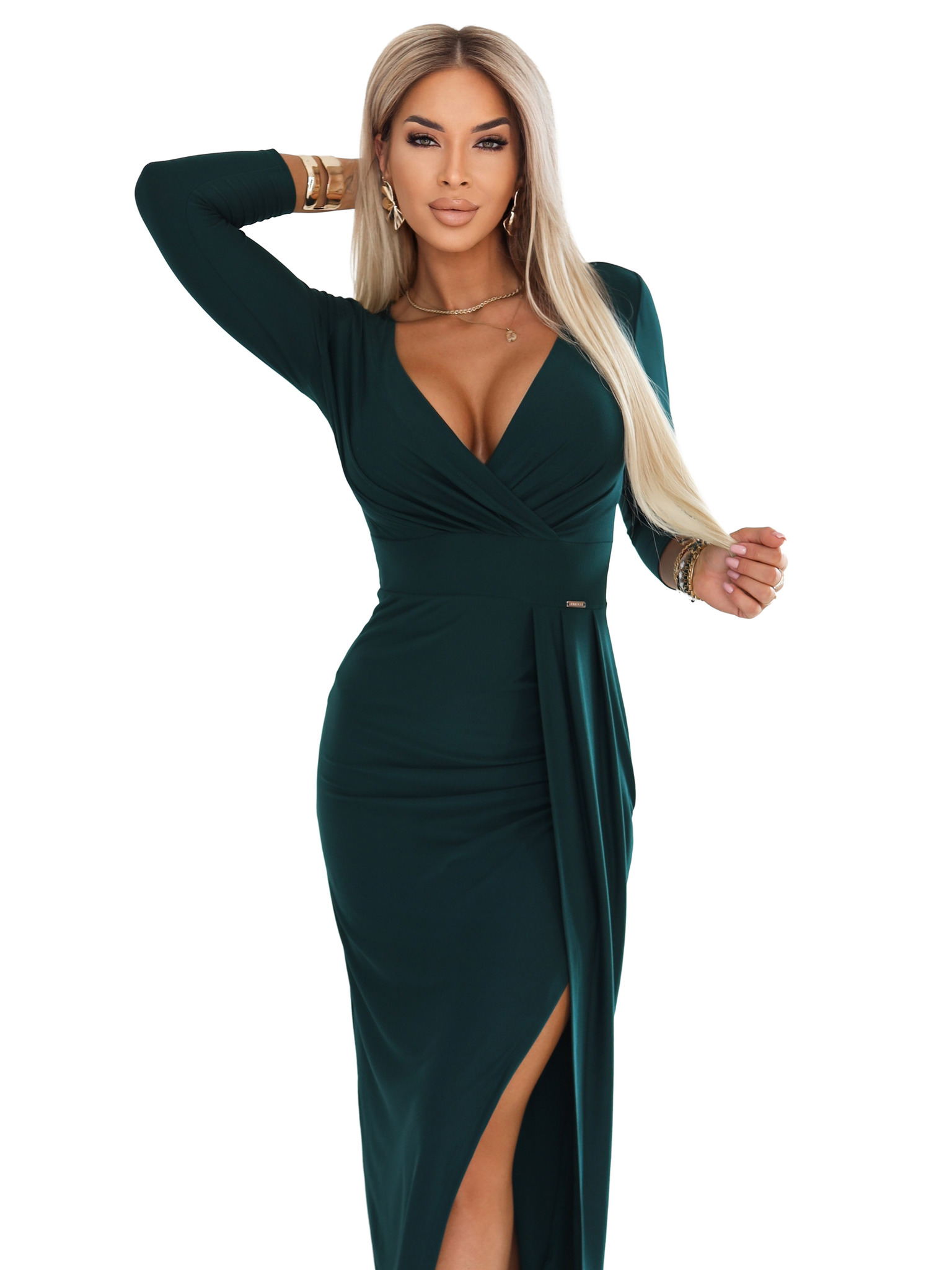 Модни, подчертаващи фигурата макси рокля с цепка - тъмнозелена