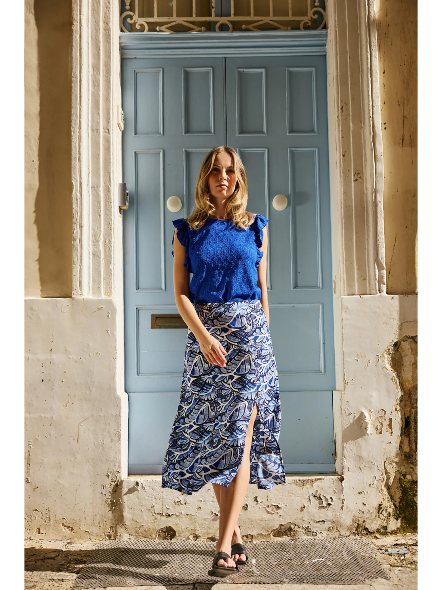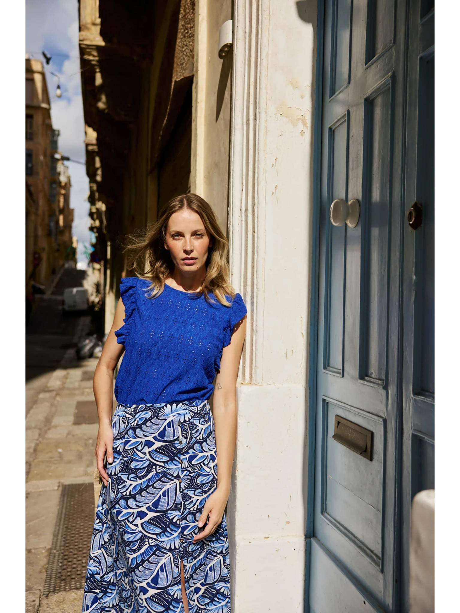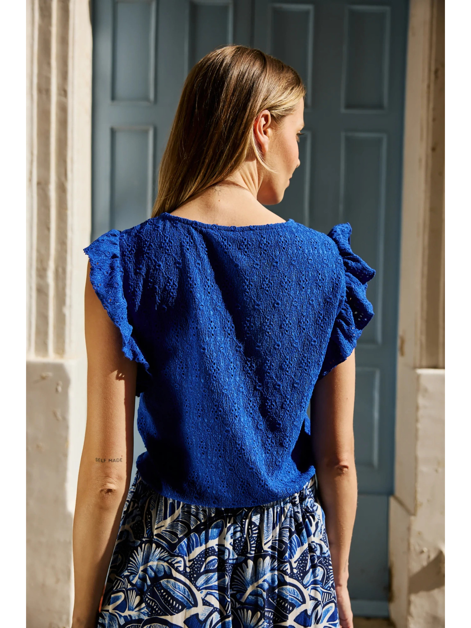 Блуза с воланчета на ръкавите синя Moodo
