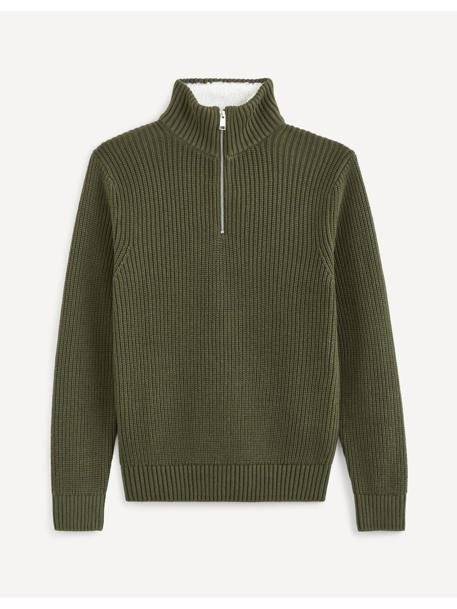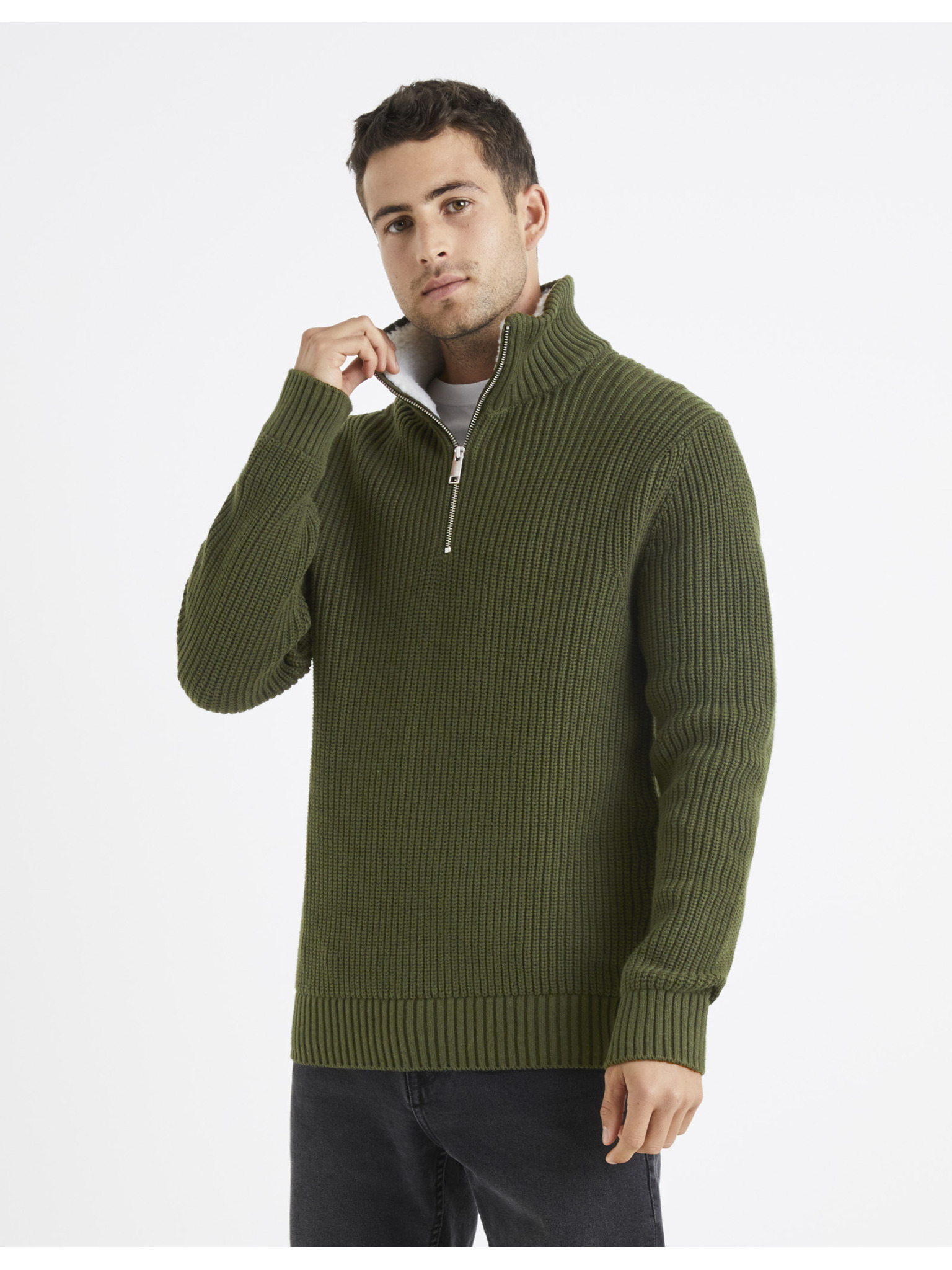 Мъжки пуловер с поло и квадратна плетка - маслинен V2 OM-SWTN-0157 Ombre Clothing