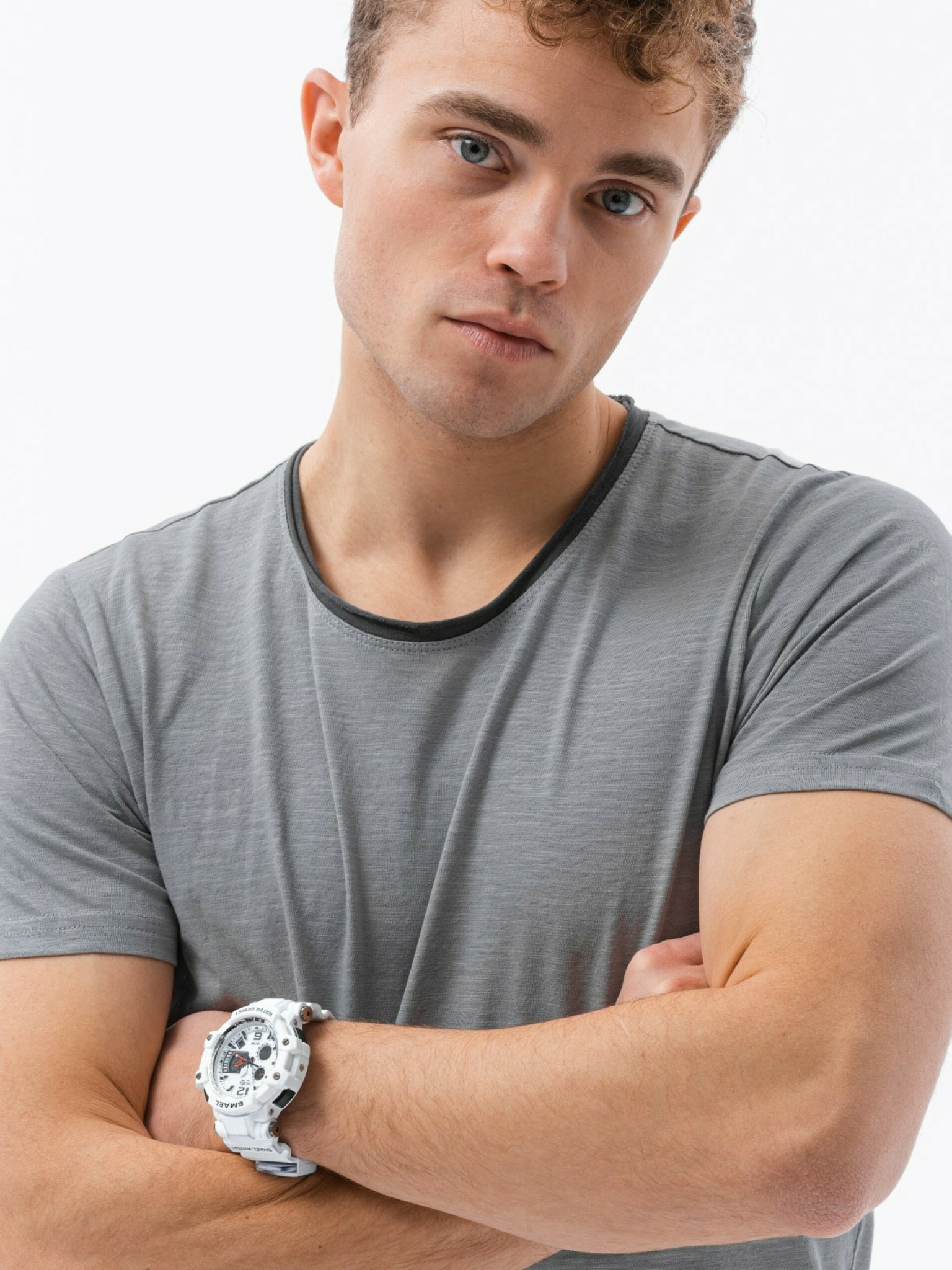 Мъжка класическа памучна тениска BASIC с деколте - светлосива