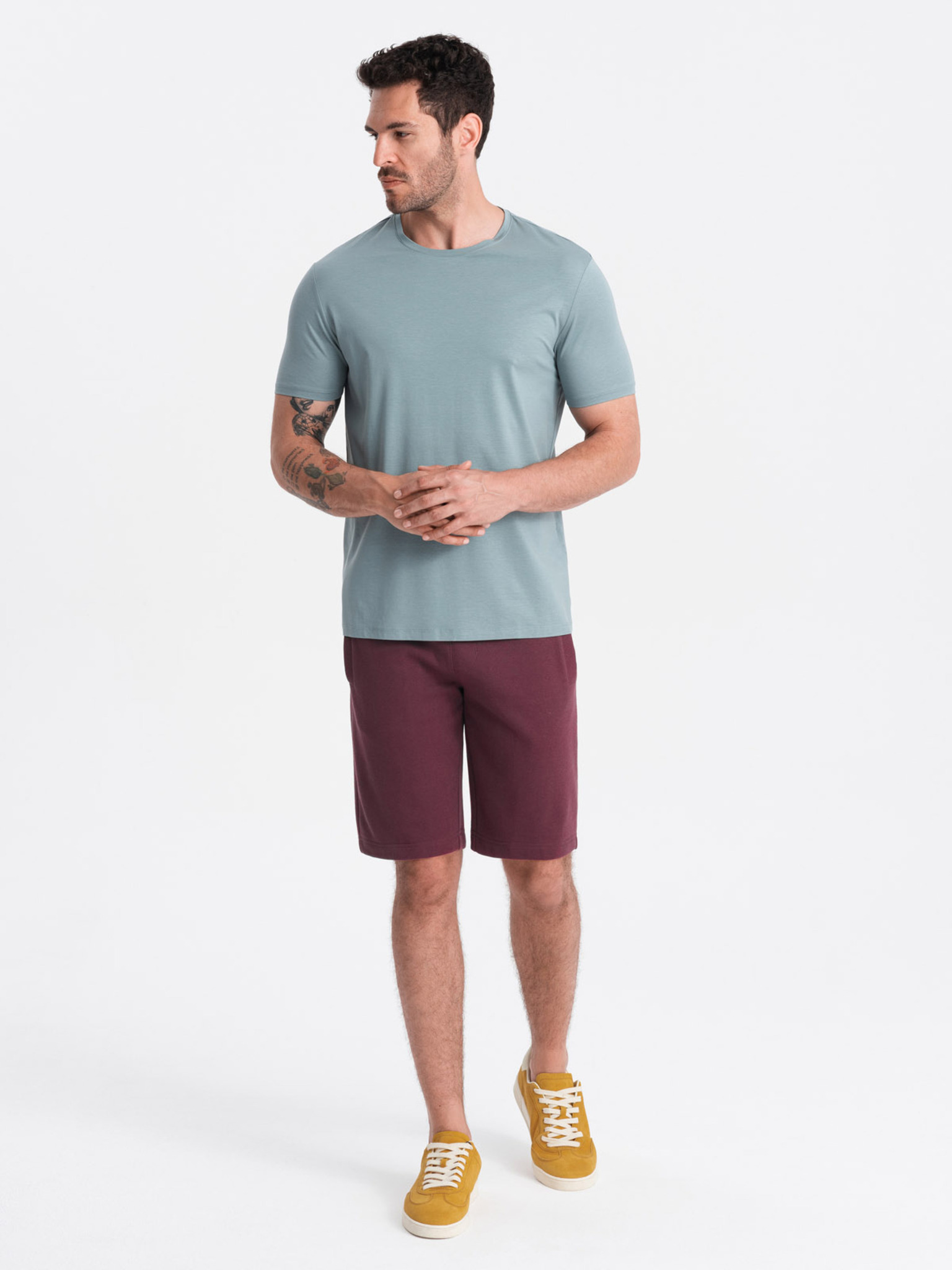 Мъжки класически дънкови шорти с подгъната крачол - светло маслинено зелено