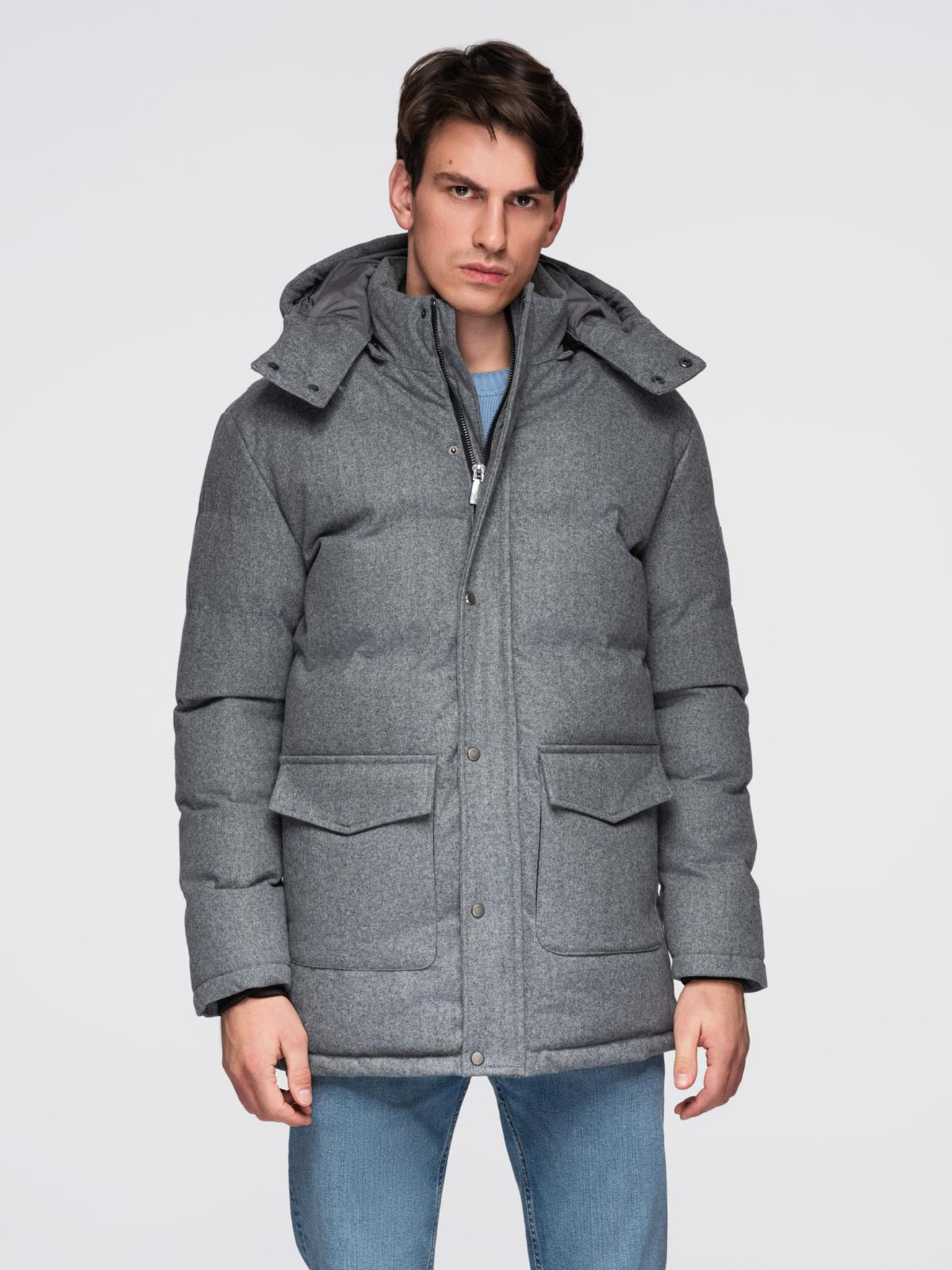 Мъжко палто тип "парка" с висока яка и асиметрично закопчаване Grey Ombre Clothing