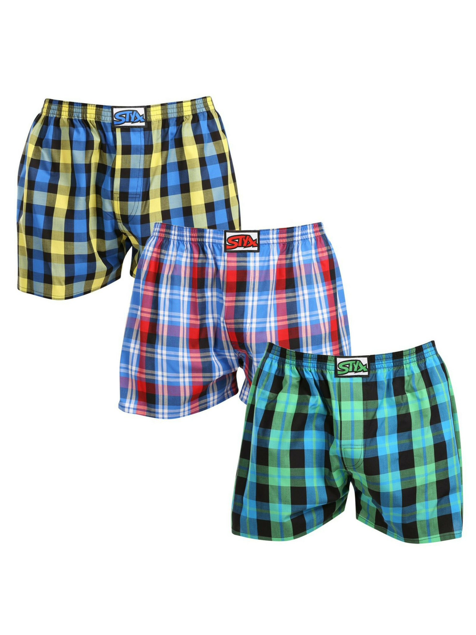 Комплект от три мъжки шарени шорти за сън в синьо, жълто и черно Styx