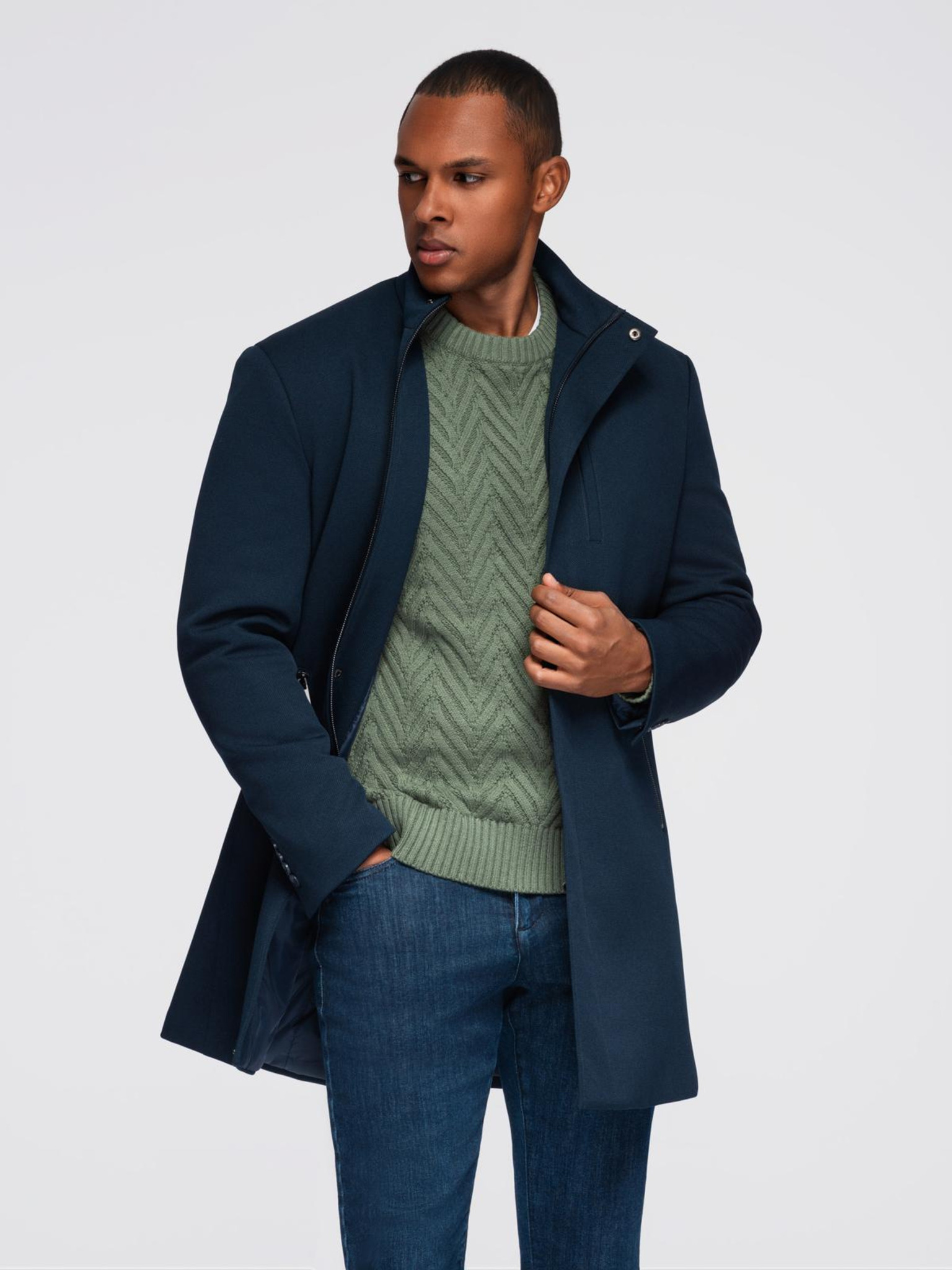 Мъжко палто с асиметрично закопчаване и висок вратовръзник - тъмносиньо V3 OM-COWC-0141 Ombre Clothing