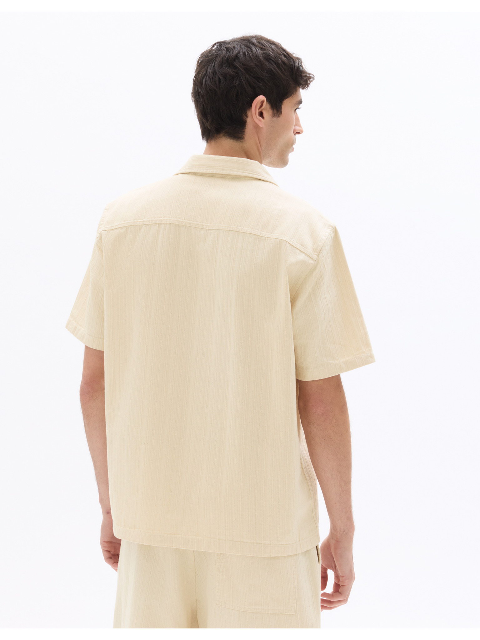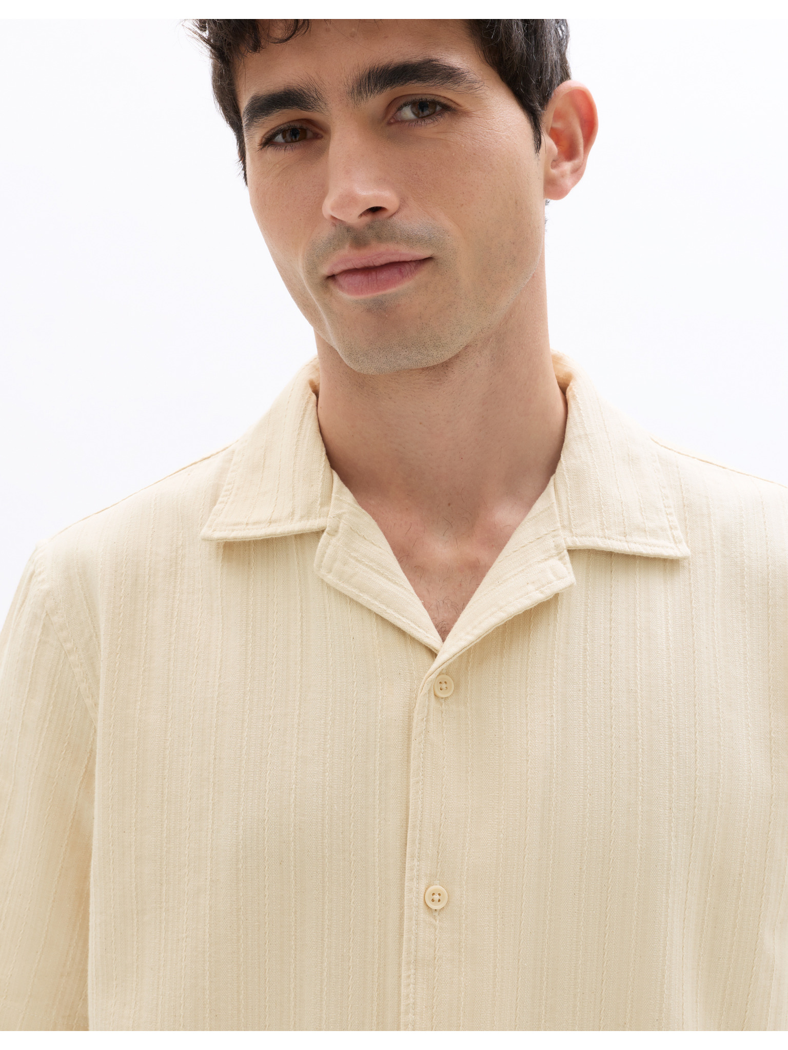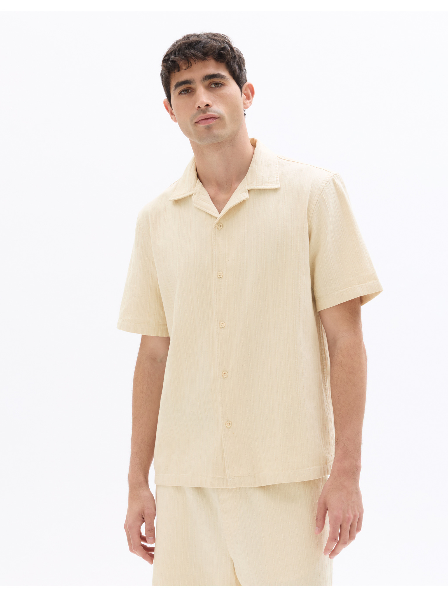 Мъжка риза с къс ръкав и кубинска яка Бежово Ombre Clothing